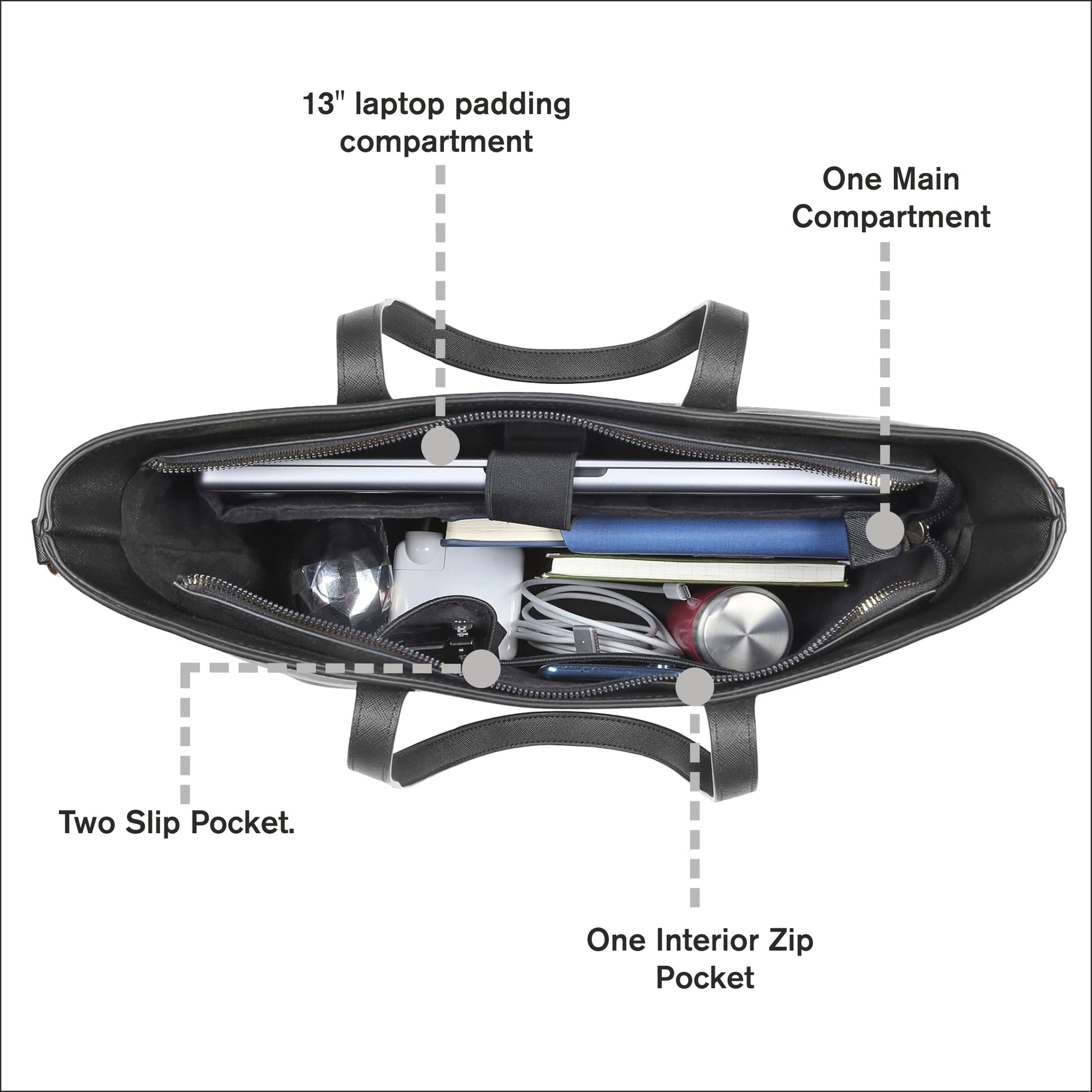 - Closes with a zip top. It has 13" laptop padding compartment , an outer zip pocket for essentials on back. Has One Main Compartment with laptop padding , One Small interior zip pocket and Two Slip Pocket