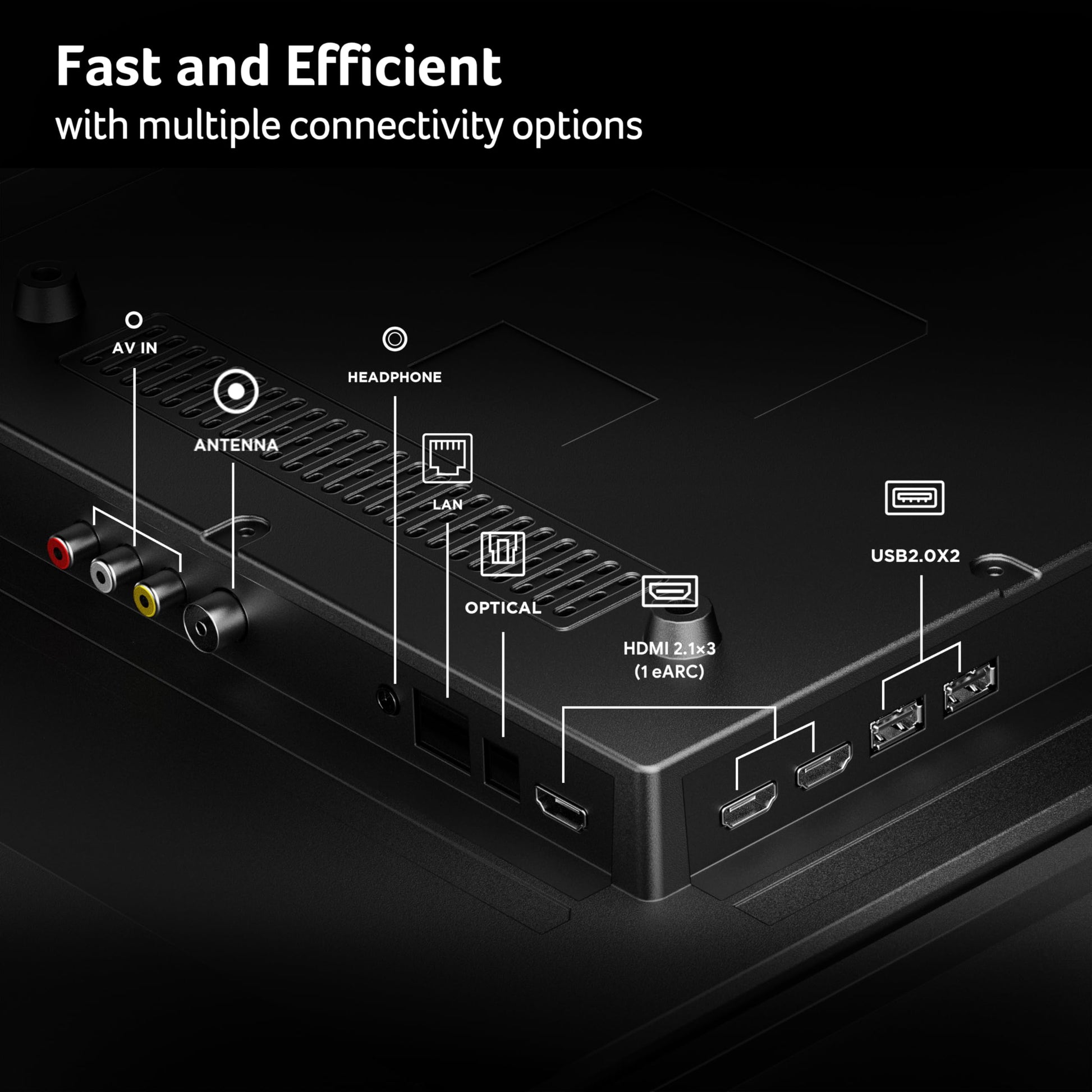 - Connectivity: Dual band Wifi | 2-Way Bluetooth 5.0 | AV, RF, Ethernet, headphone×1 | HDMI Ports 2.0 x 3 to connect personal computer, laptop, set top box, gaming console | USB 2.0x2 to connect hard drives or other USB device