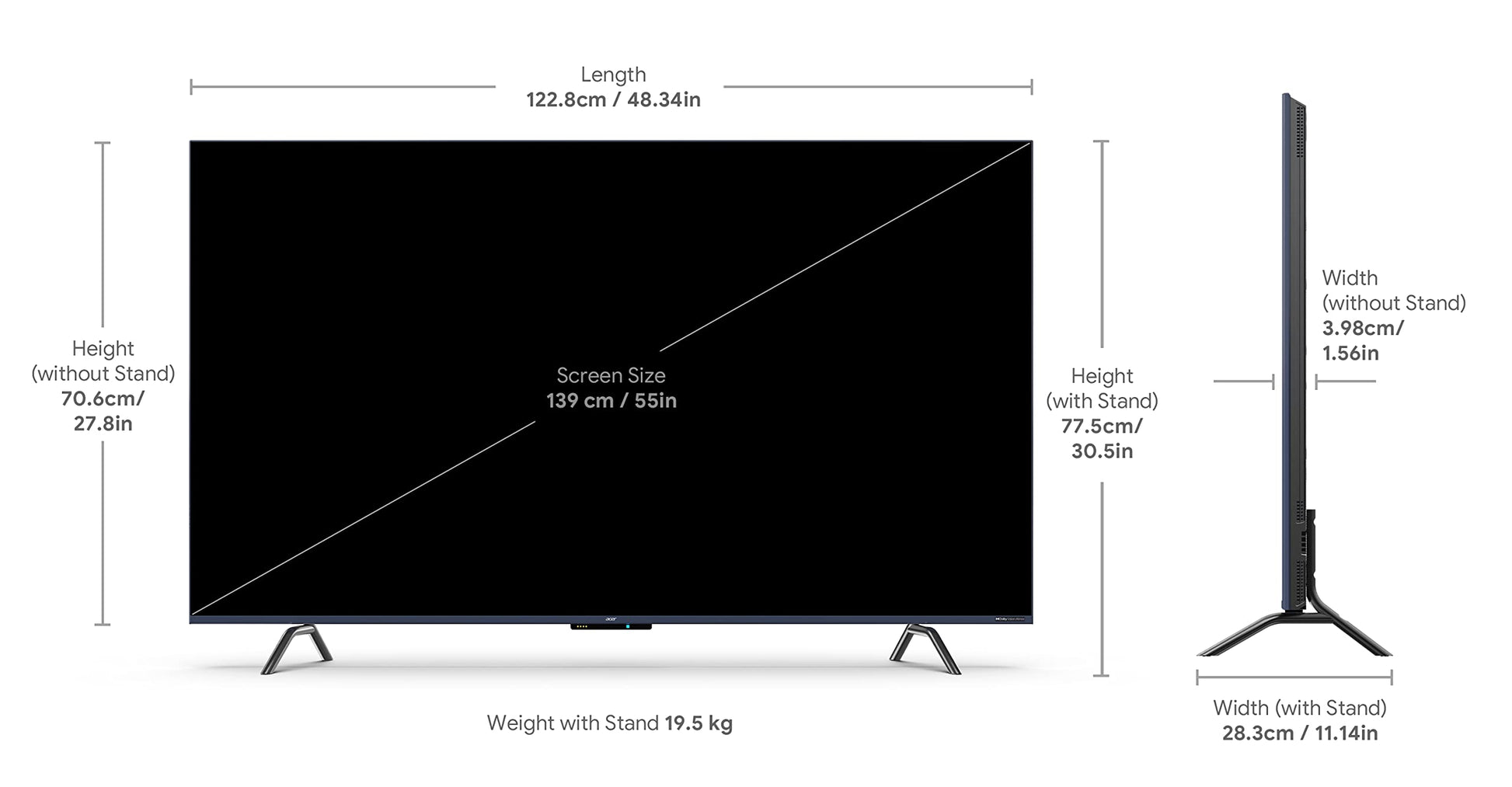 - Display: QLED | 4K HDR | DCI-P3 95% NTSC 98% | HDR10+ with HLG | Dolby Vision | 4K Upscaling | MEMC | Dynamic Signal Calibration | 1.07 Billion Colours | WCG+ | Super Brightness | Local Dimming | Blue Light Reduction | 178 Degree Wide Viewing Angle