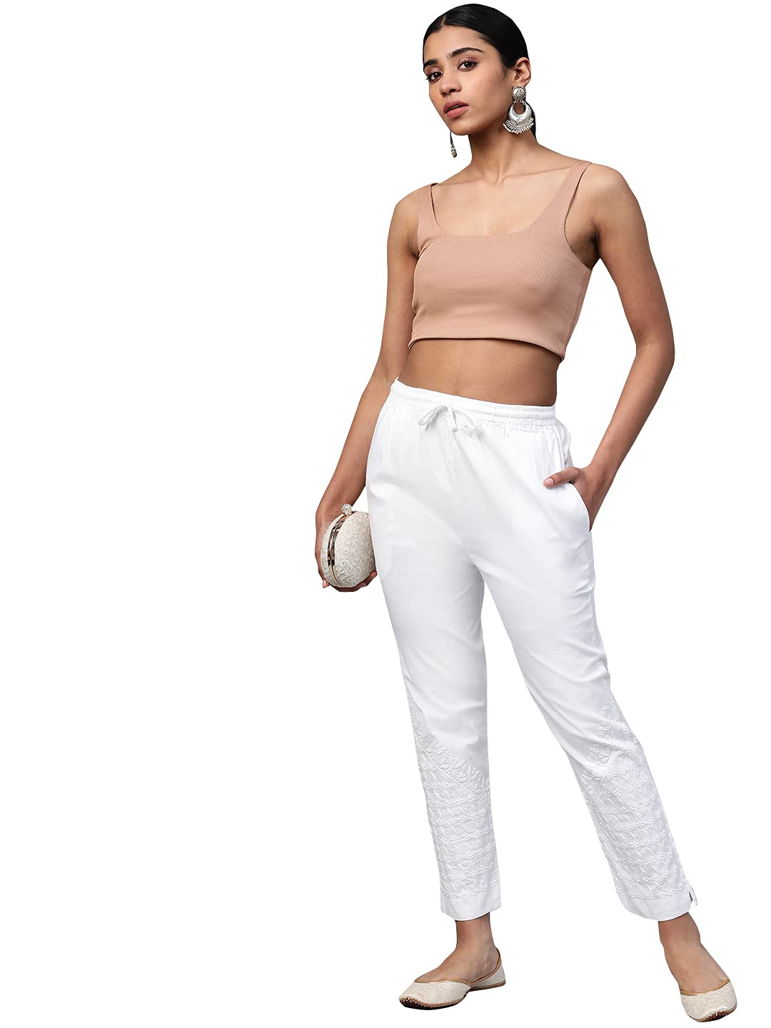 Ada Hand Embroidered Lucknowi Chikankari Straight White Cotton Palazzo Pant Trouser for Womens A711127 (2XL)