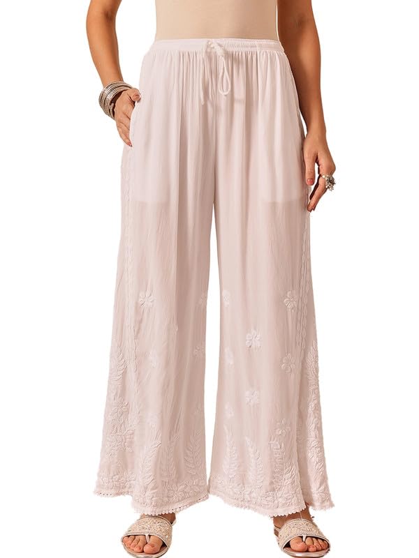 This White Modal Chikankari Palazzo is soft and comfortable to wear. This Palazzo will enhance the wearer's personality and give her a fresh look. Complete the outfit with yellow chikankari kurtas, juttis, and statement earrings for an effortlessly chic ensemble. These palazzos are known for their breathable texture and elegant, intricate patterns, making them perfect for both casual and festive occasions.