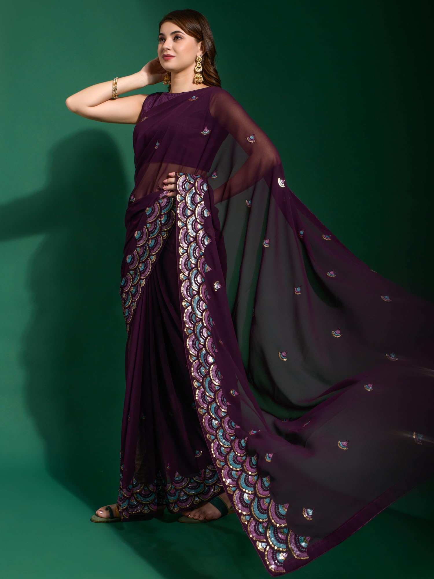 AKHILAM Women's Georgette Purple Embellished Designer Saree With Blouse Piece (CHNDANI20_VP)