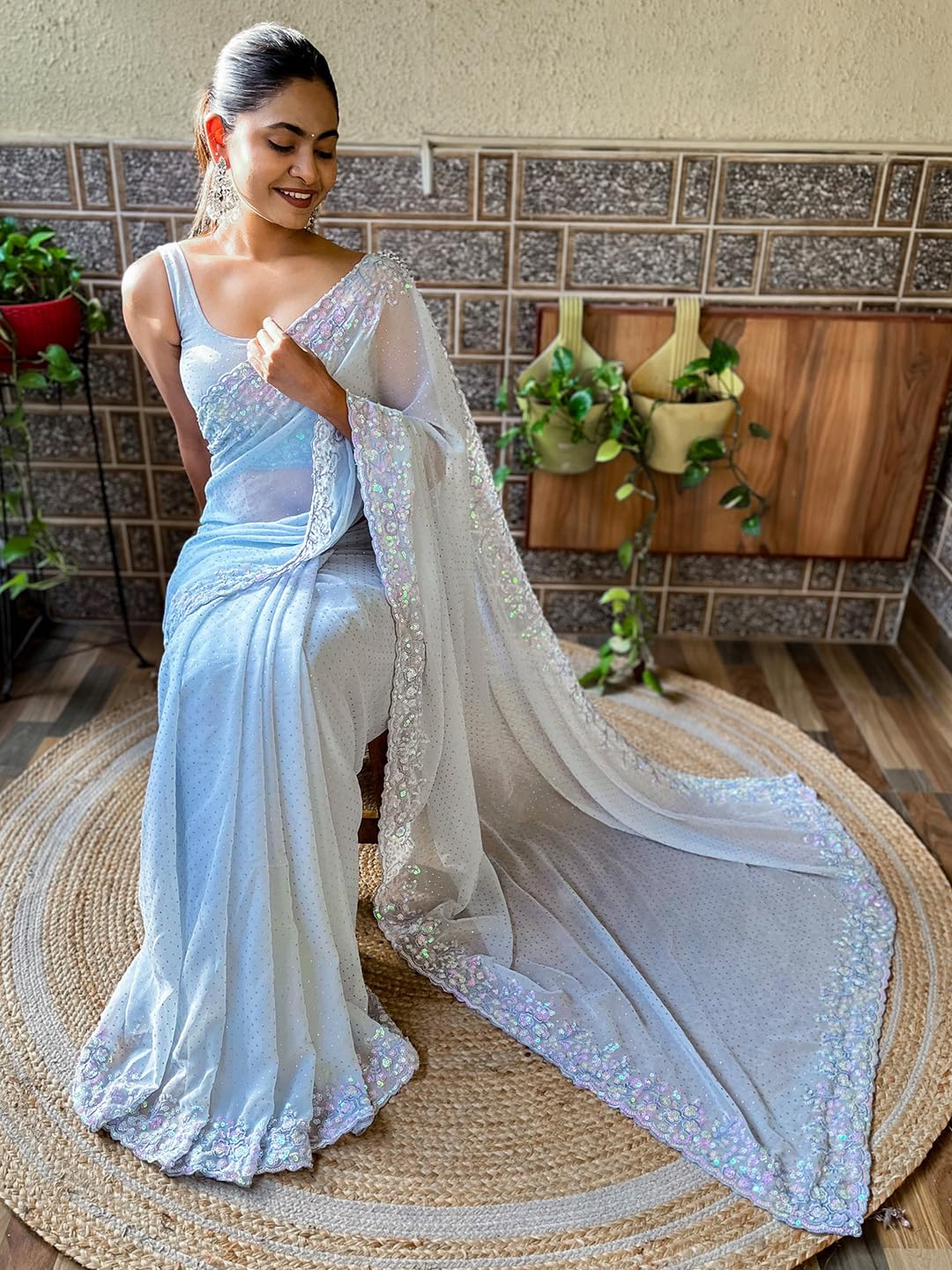 AKHILAM Women's Grey Georgette Sequins Embellished Saree with Unstitched Blouse Piece (KESARI5203_KR)