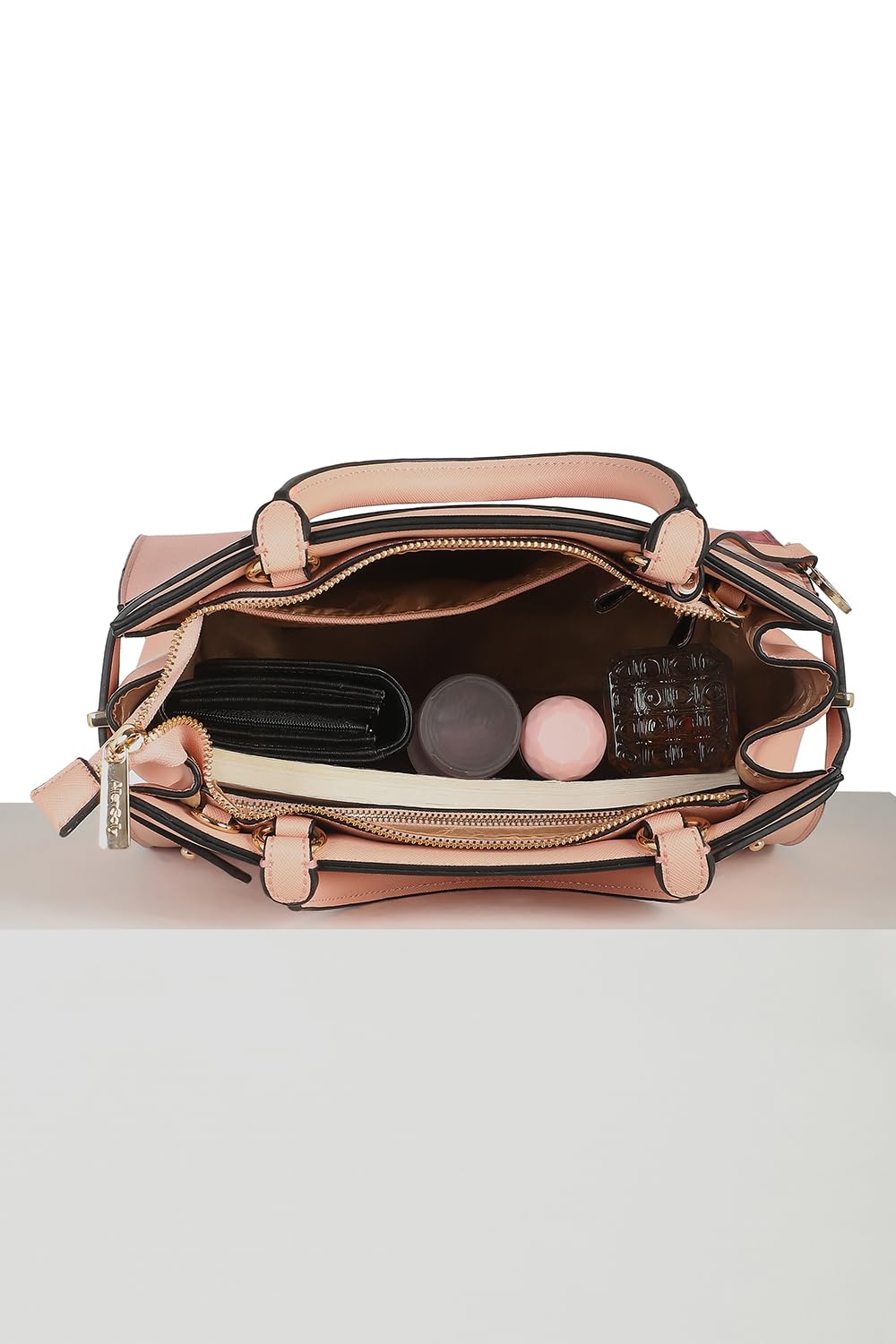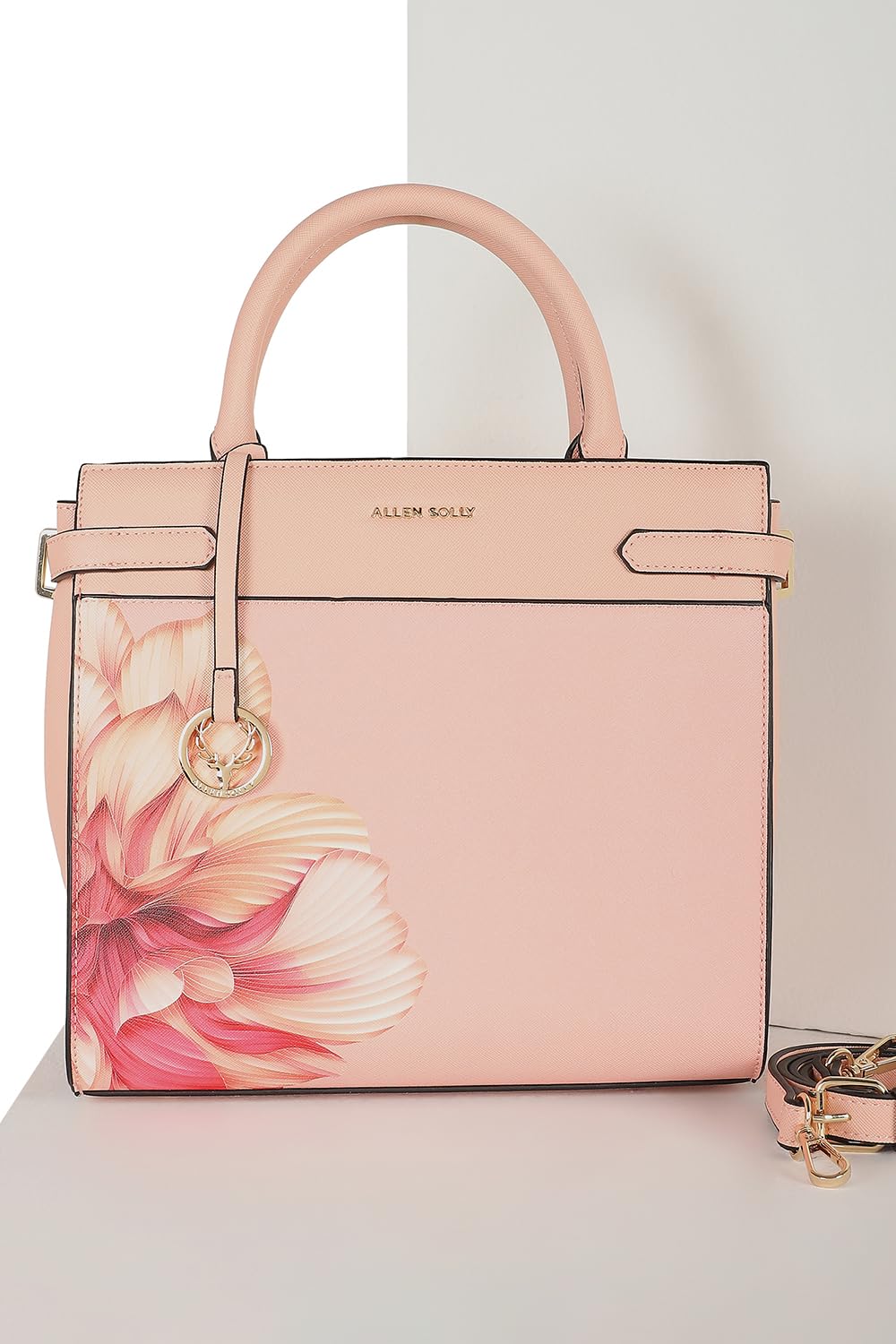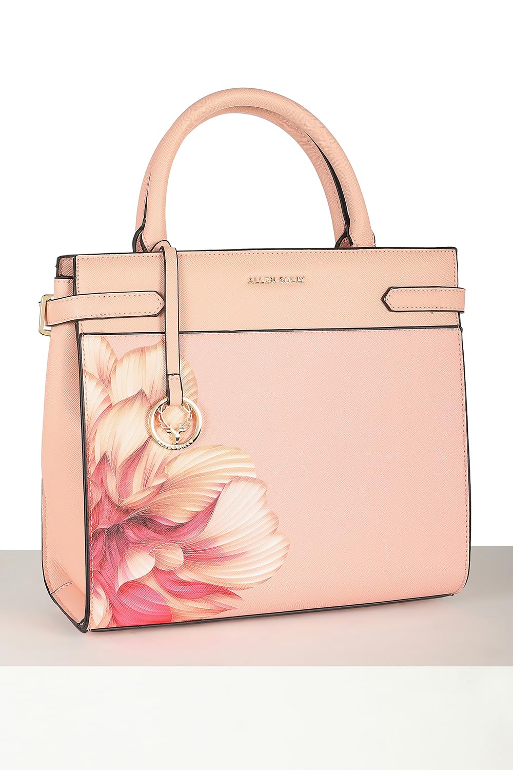 The Allen Solly women's handbag in a delightful peach shade elevates casual outings with its chic printed design. Crafted from durable polyester, this stylish accessory seamlessly blends functionality and fashion. Its vibrant color adds a pop to any outfit, making it a versatile choice for everyday wear. Discover the perfect companion for your essentials and let your style shine effortlessly.