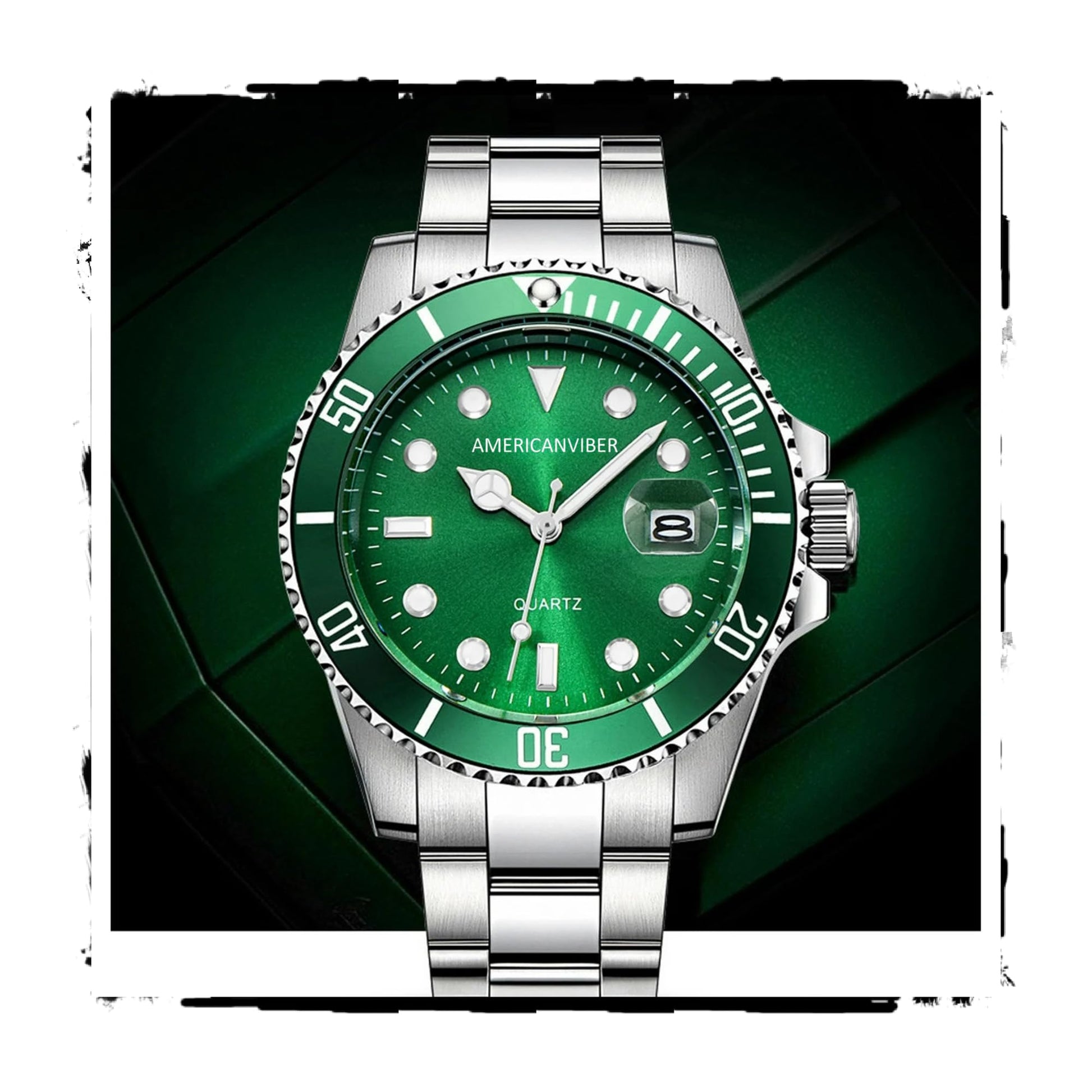 AMERICANVIBER Luxury Diver Watch with Green Dial, Stainless Steel Band, Date Display, Quartz Movement (Green)
