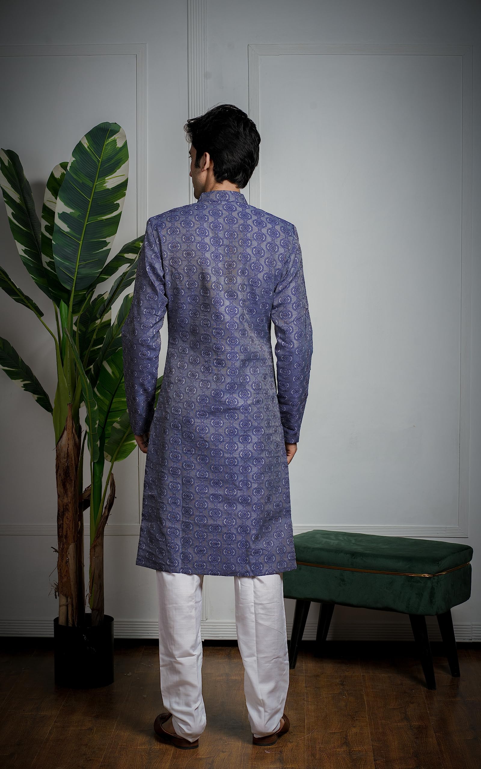 Amzira Sherwani Set with top and bottom will fit you like a glove and will keep you comfortable owing to the Good quality Fabric . Cut a fine figure as you adorn this Sherwani with Dhoti pair of traditional mojaris.