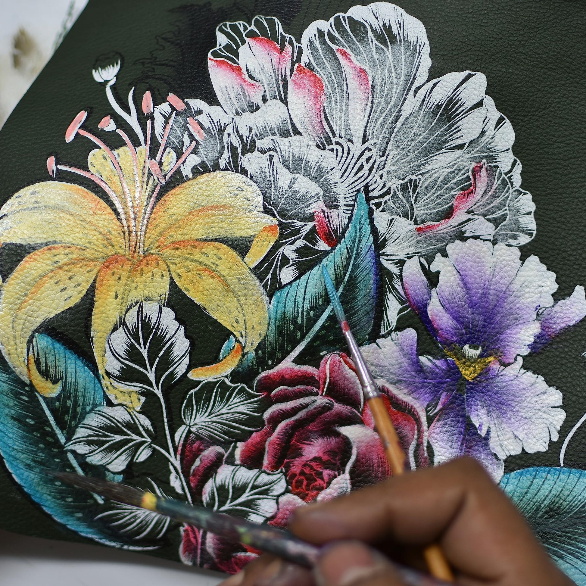 - VINTAGE FLORAL ARTWORK - Each bag is hand-painted to create a piece of art inspired by nature and vintage themes. This design captures delicate blooms and intricate details that evoke a sense of timeless beauty and refined nostalgia