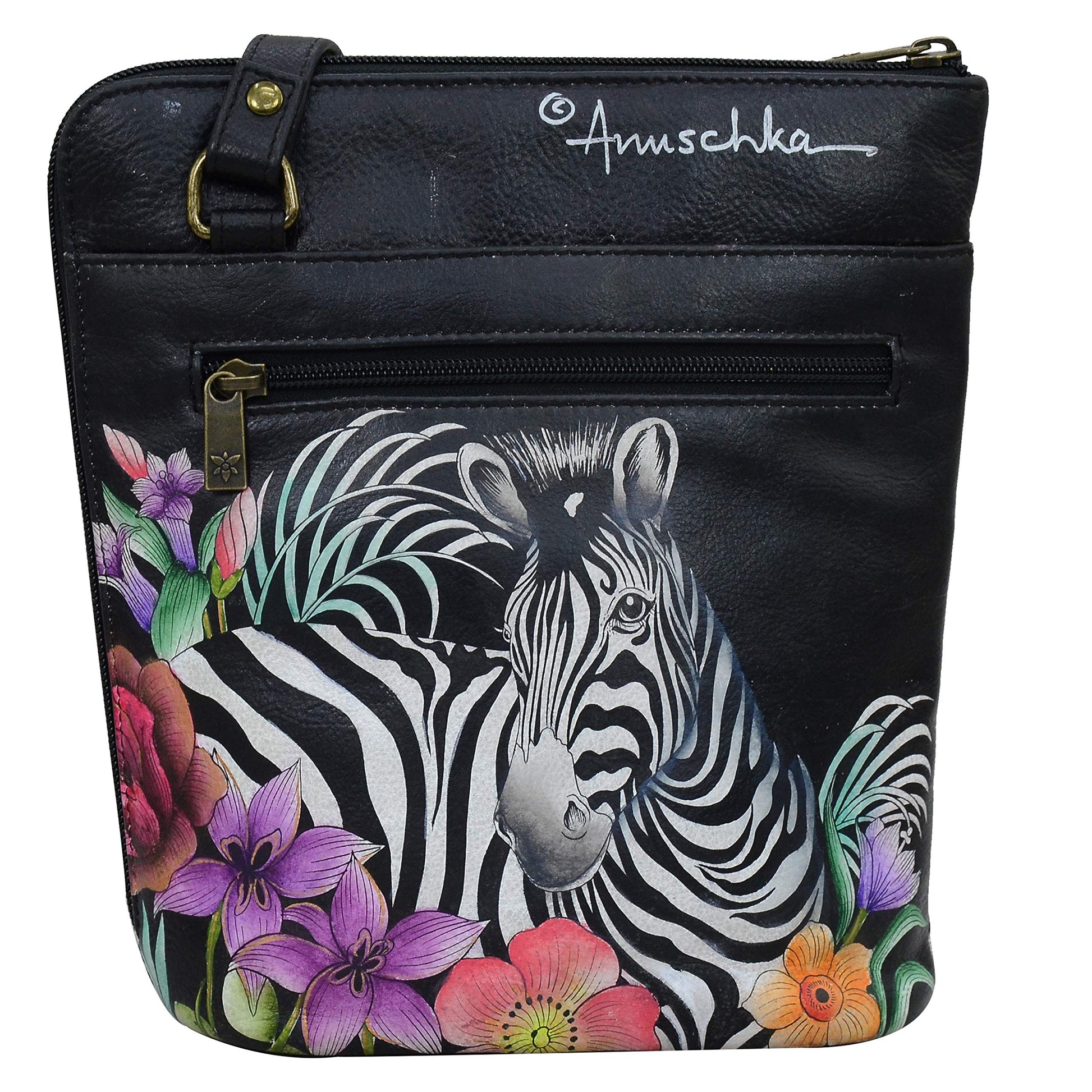 Anuschka Women's Hand Painted Genuine Leather Crossbody Organiser With Extended Side Zipper - Playful Zebras