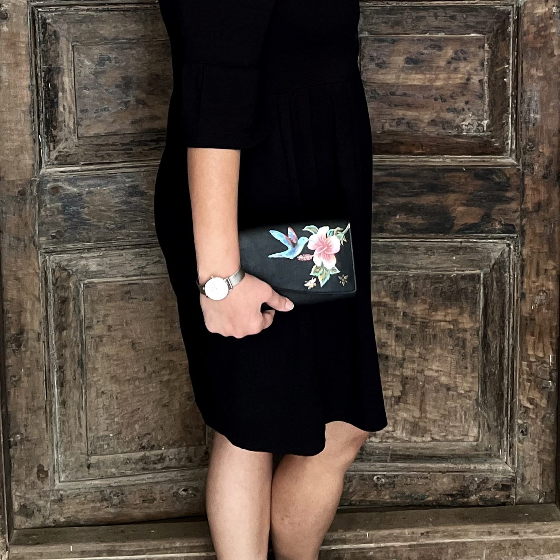 - HUMMINGBIRD BLACK ARTWORK - Each wallet is hand-painted to create a piece of art inspired by nature and vintage themes. A gorgeous hummingbird inspects a blooming hibiscus flower, all painted in shades of blue and pink on a black backdrop