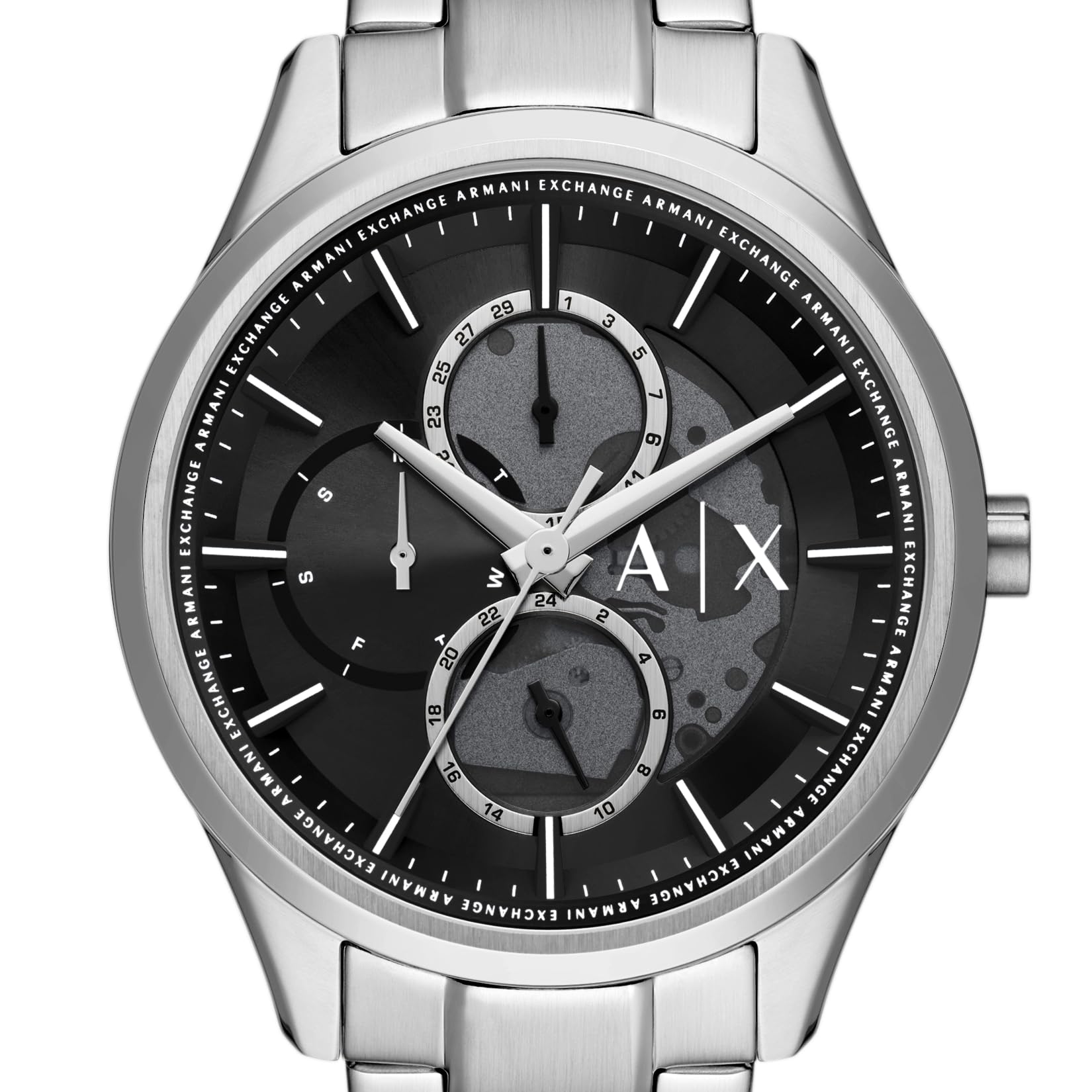 Details: Armani Exchange's 42mm watch features a black sunray dial, multifunction movement and stainless steel bracelet.