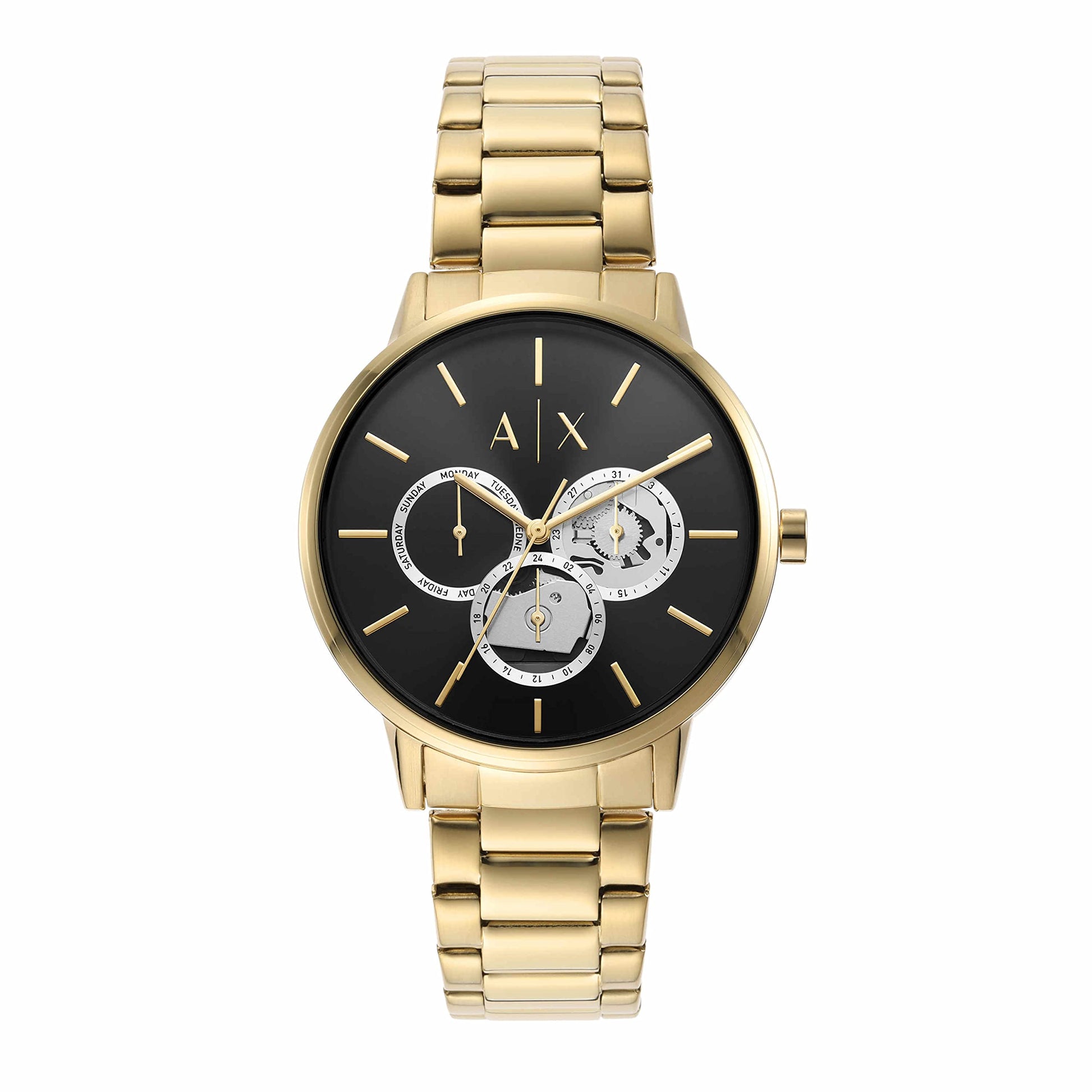 Armani Exchange's 42mm watch features a black skeleton dial, at least 50% recycled stainless steel case, multifunction movement and gold-tone stainless steel bracelet.