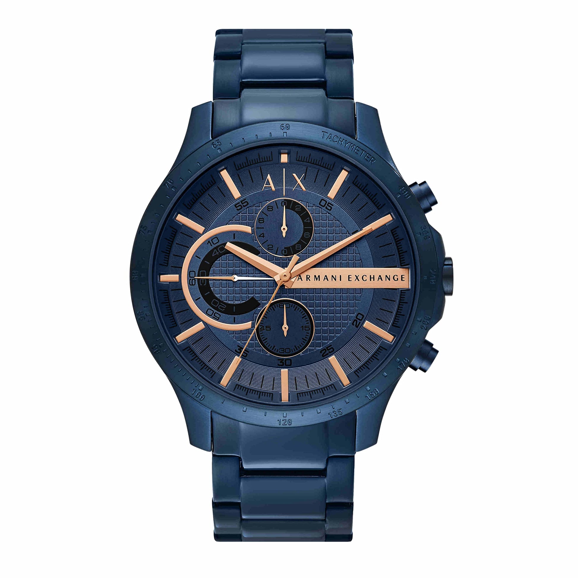 - Blue plated stainless steel bracelet with bracelet deployant closure; interchangeable with Armani Exchange 22mm watch straps