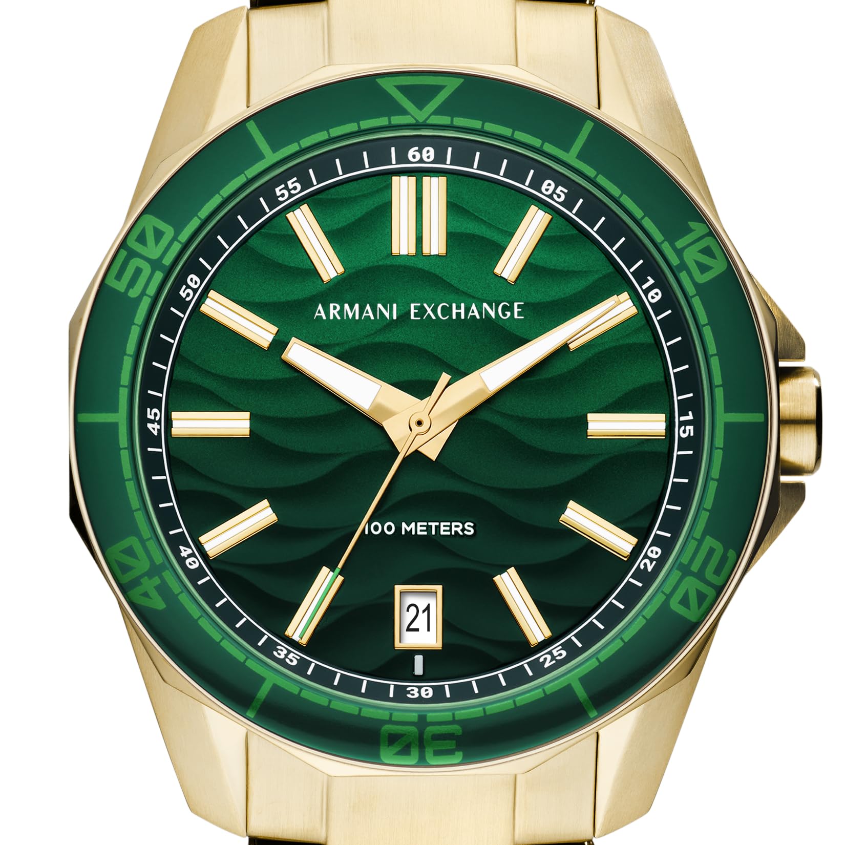 Details: Armani Exchange's 44mm watch features a green wave-inspired textured dial, 100 meter water resistance, rotating bezel, three-hand date movement and gold-tone stainless steel bracelet.