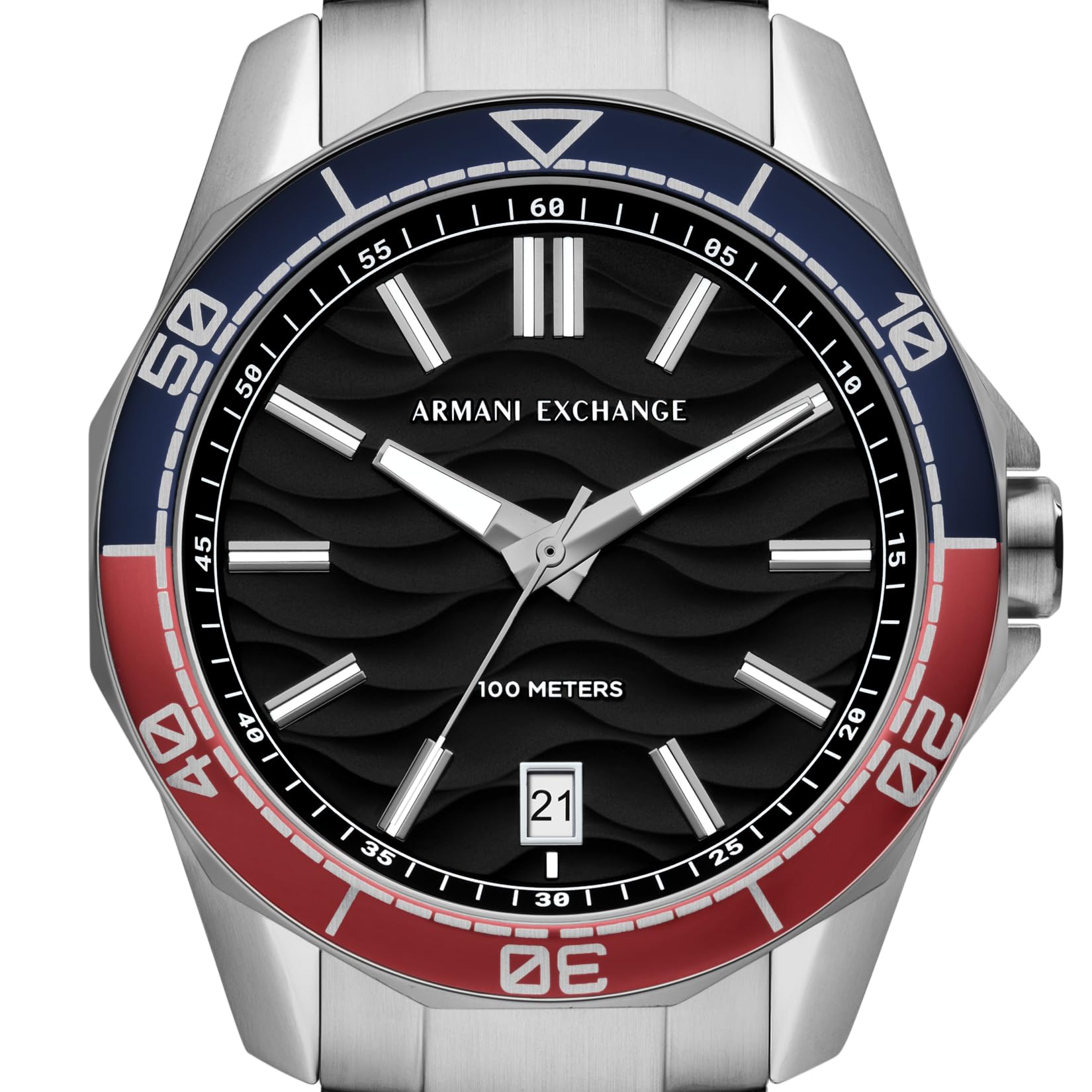Armani Exchange's 44mm watch features a black wave-inspired textured dial, 100 meter water resistance, three-hand date movement and stainless steel bracelet.