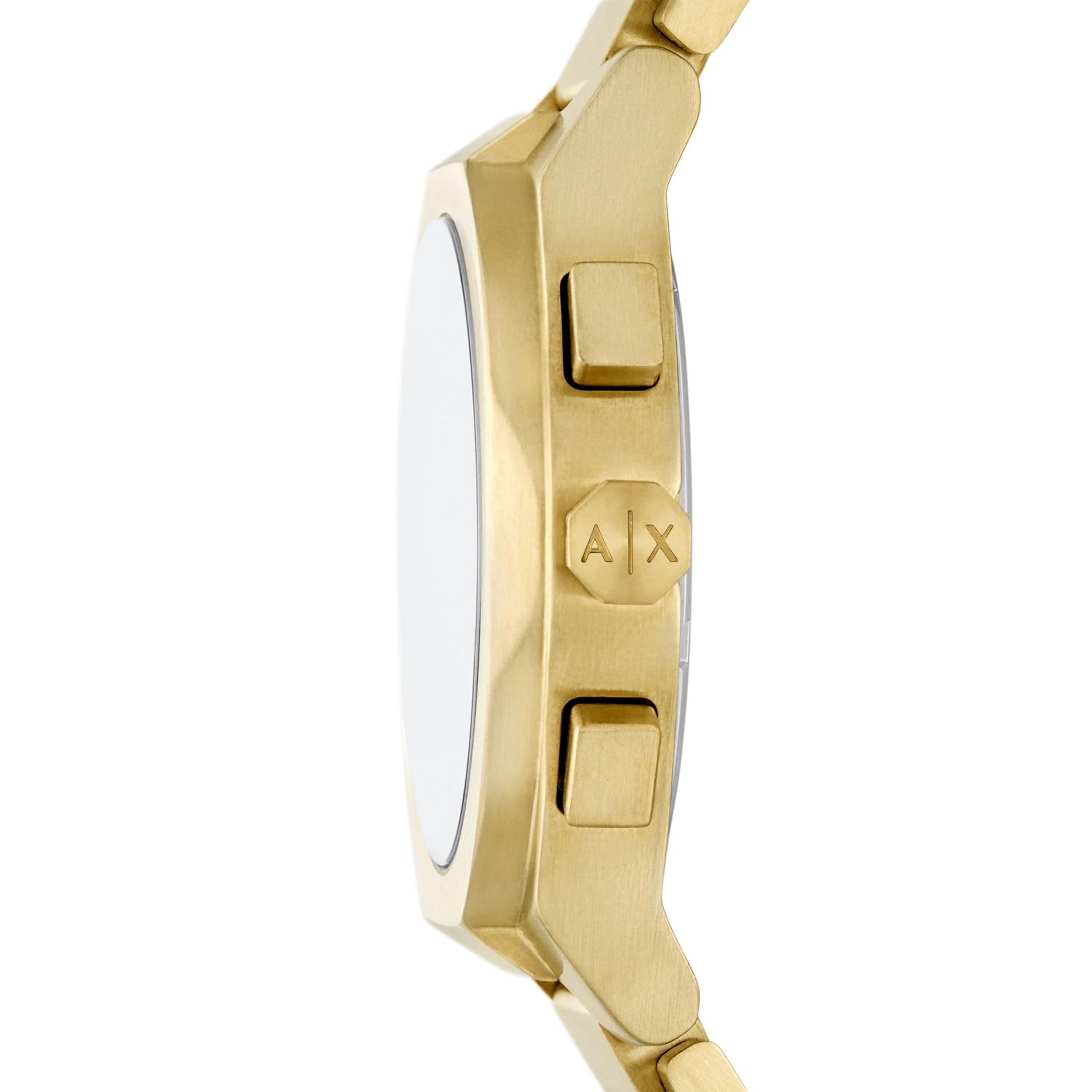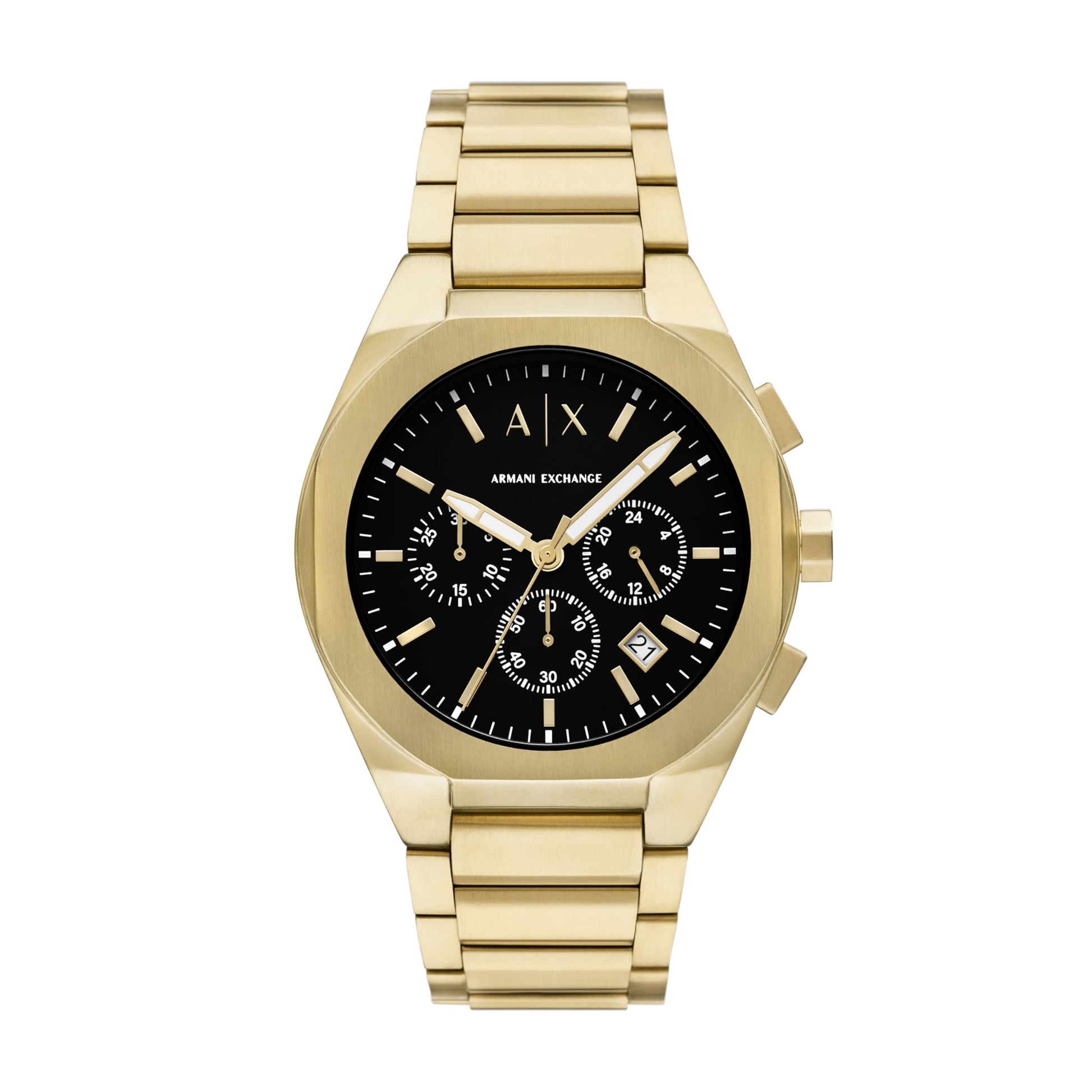 Armani Exchange's 42mm watch features a black sunray dial, chronograph movement and gold-tone stainless steel bracelet.