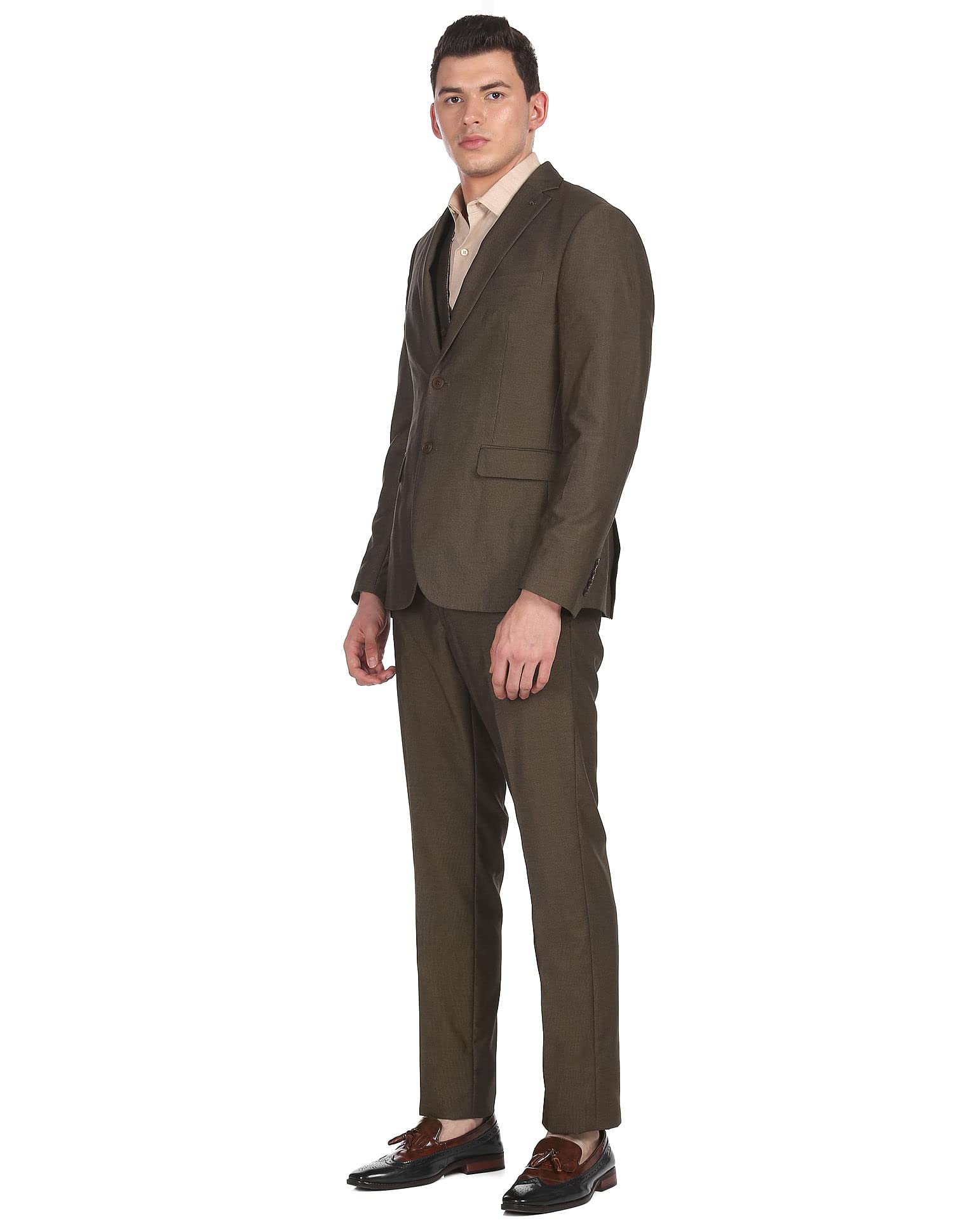 With an interestingly sharp finish, this suit from Arrow lends your office wear collection a bit more punch. It's made from polyester and rayon blend which is soft and stretchy, yet durable. Case in point, it is the perfect blend of softness, sophistication and breathability. The blazer has softly padded shoulders for some gentle structure, notch lapels and a comfortable double vent. The trousers are unhemmed so you can have them tailored to your specifications.