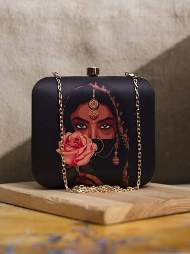 - About the Product: The Artklim Black Based Floral Woman Printed Clutch is a chic and sophisticated accessory designed for modern women. Its captivating floral woman print against a sleek black background adds a touch of elegance to any ensemble.