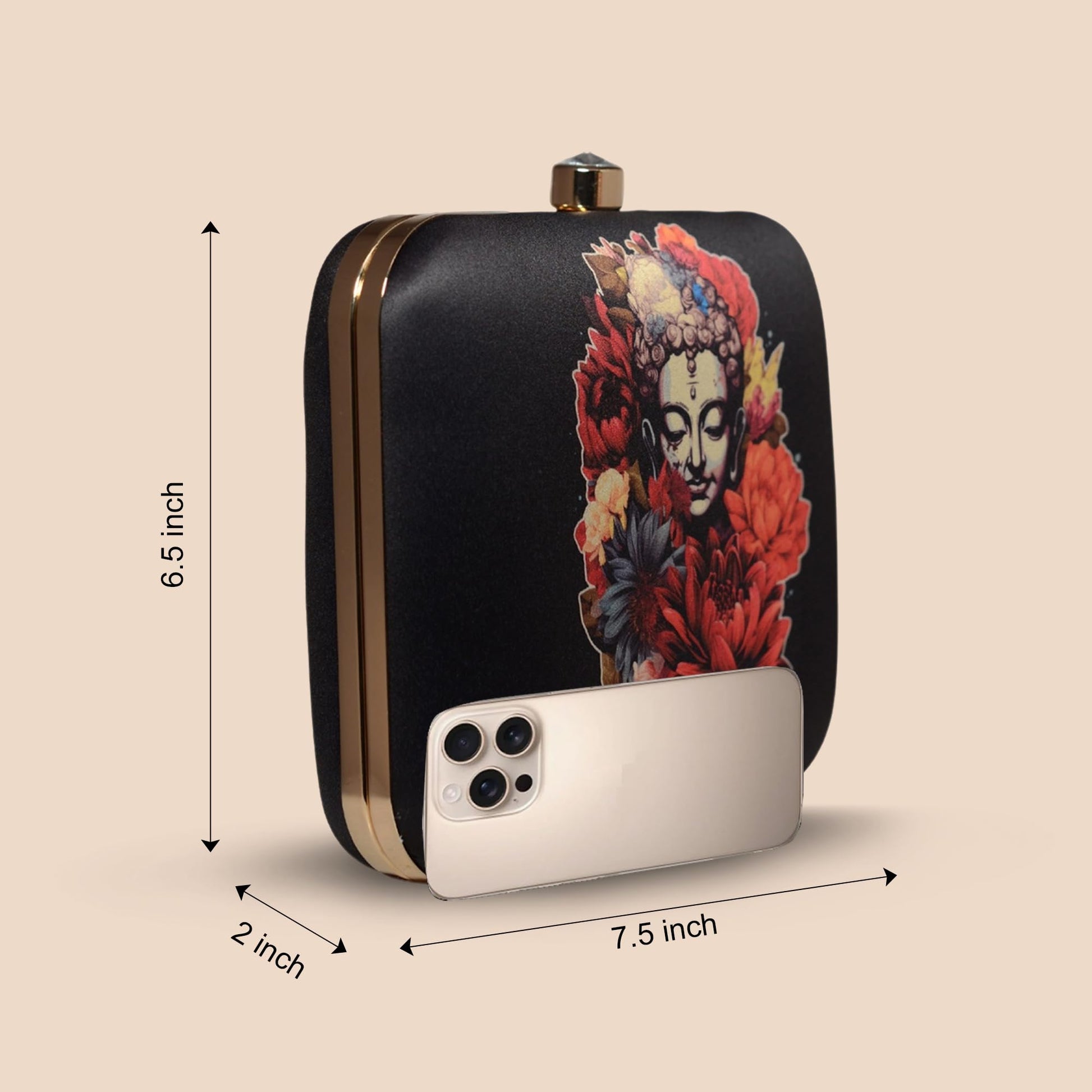 - Ethnic clutch bag: this black buddha & flowers print designer clutch bag for women combines artistic prints with sleek design, offering a statement look. A versatile statement clutch for women among printed sling bags.