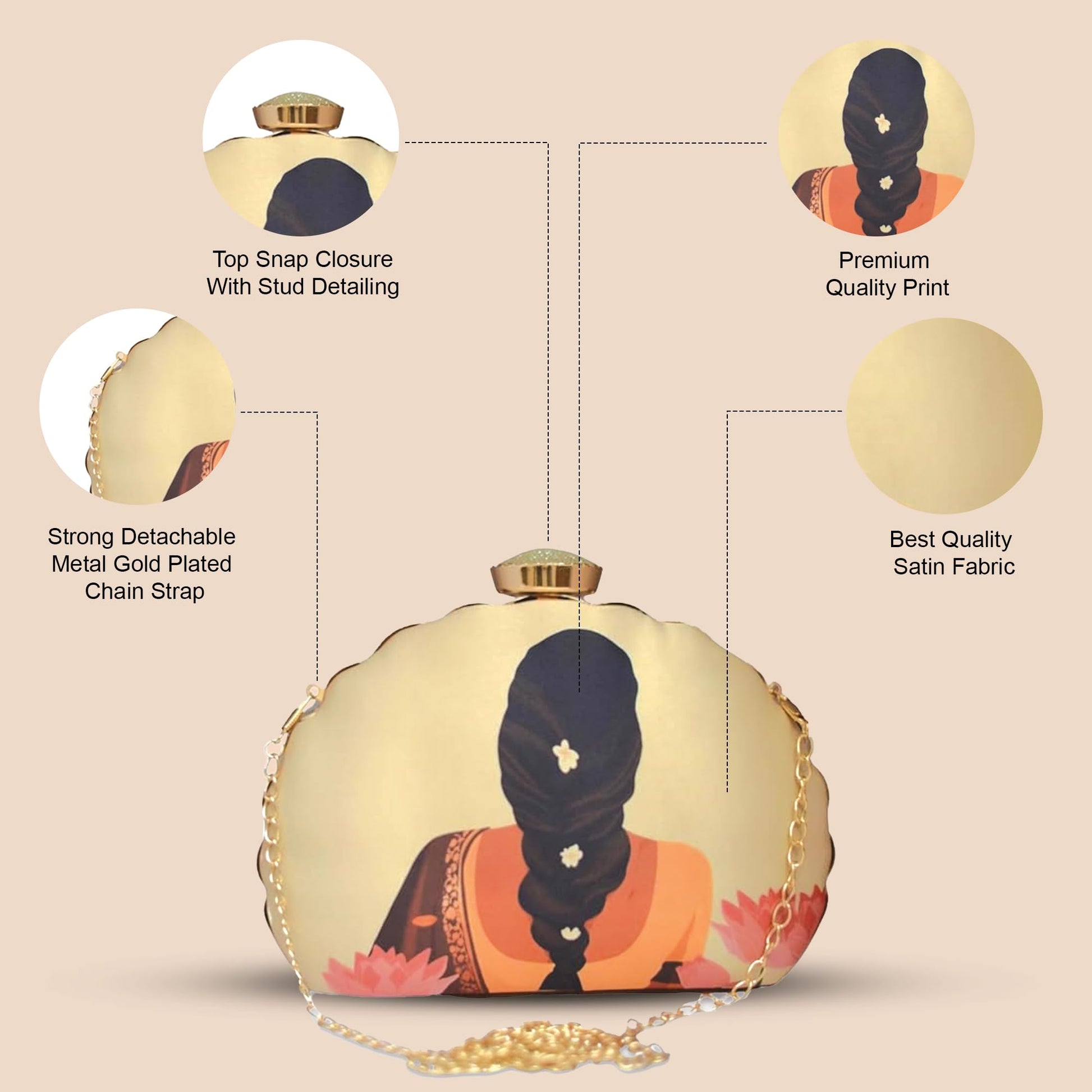 Artklim D - Shaped Flower Lady Printed Festival, Wedding Clutch Bag For Women With Detachable Chain Sling Strap | Purse for Navratri | Clutches for Navratri | Bags
