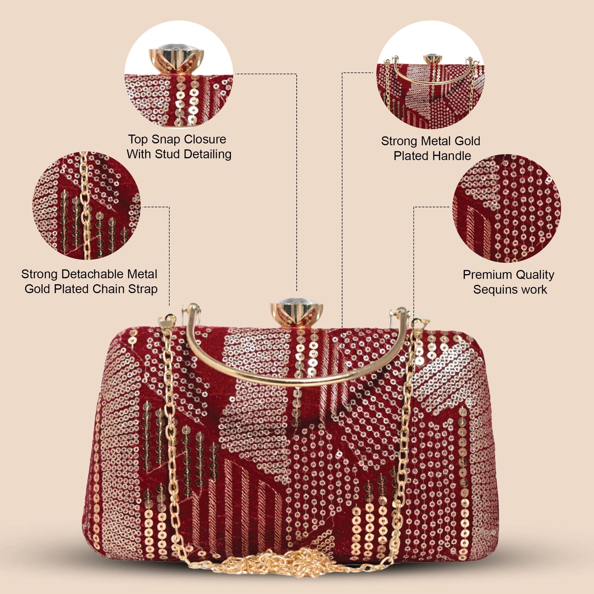 Artklim Sequins Embroidery Velvet Party Clutch Bag For Women | Wedding Clutch Purse With Detachable Chain Sling Strap, Maroon
