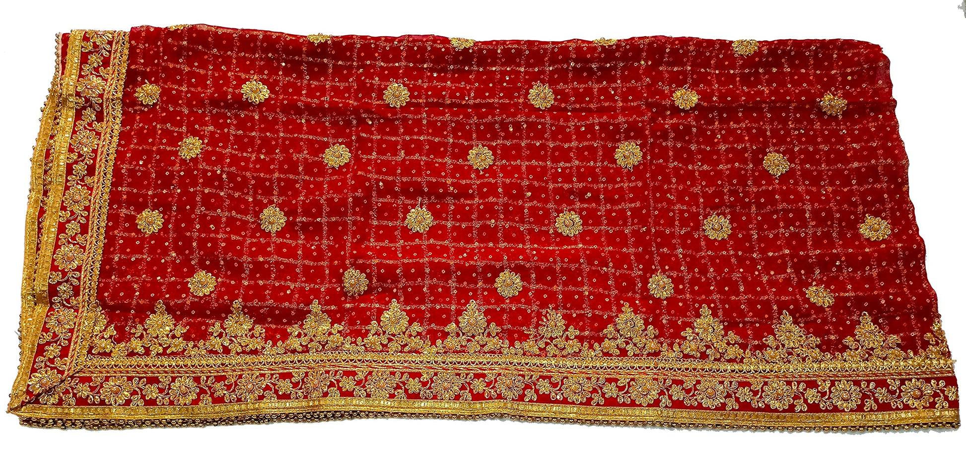 RED BANDHANI DUPATTA WITH VELVET BORDER AND ALL SIDES MOTI SPECIALLY USED IN WEDDINGS AND NIKAH , IT CAN BE ALSO USED FOR CHANYA CHOLI DUPATTA AND FOR MATA KI CHUNRI