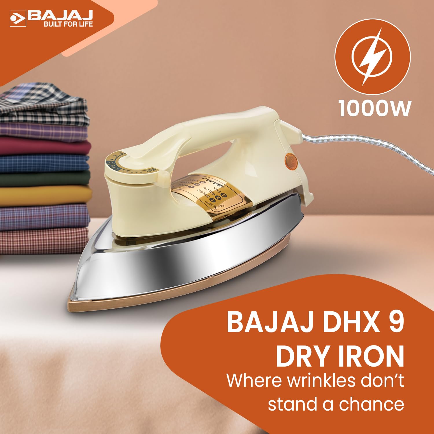Bajaj DHX-9 1000W Heavy Weight Dry Iron | Advance Soleplate And Anti-Bacterial German Coating Technology | Multiple Temperature Levels | 2 Yr Warranty 【Ivory】