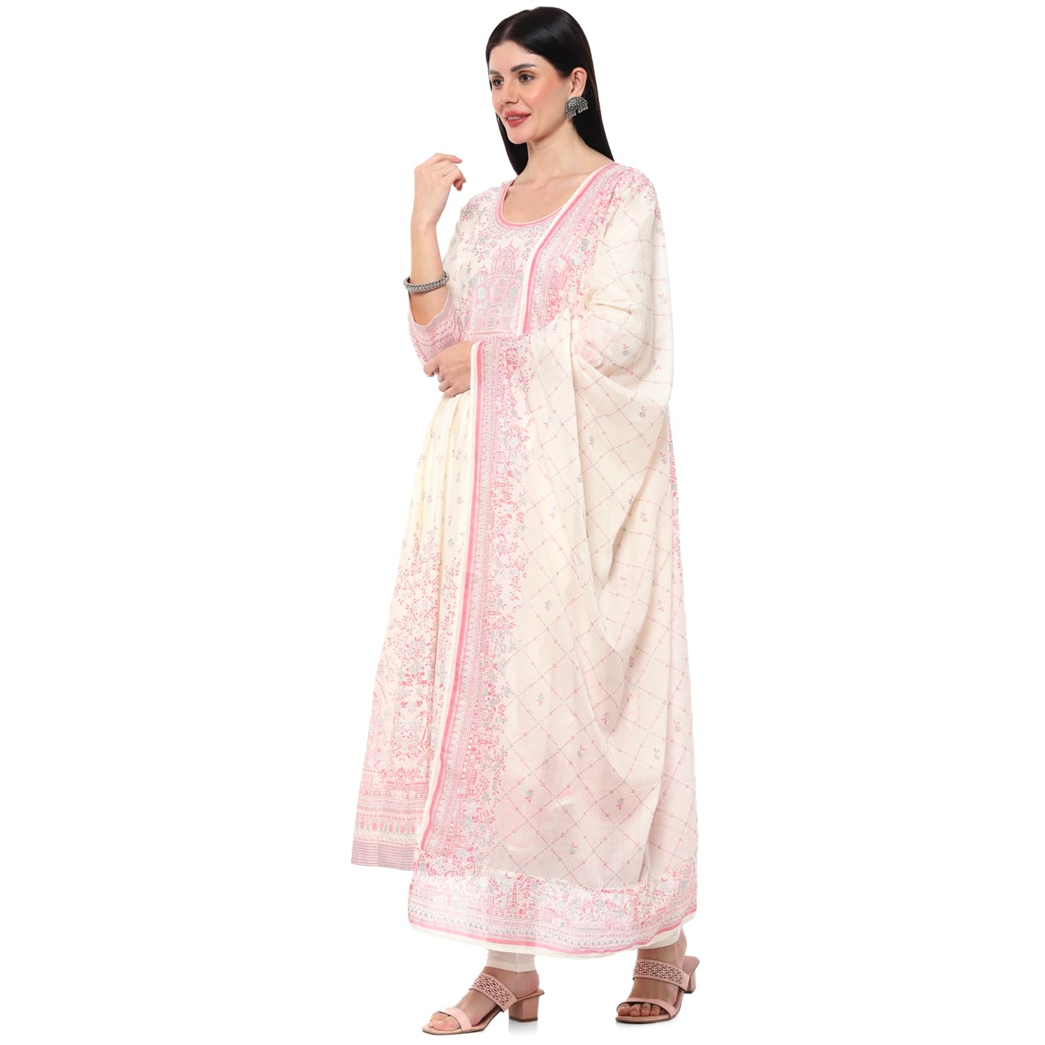 BIBA Cotton Women Printed Anarkali Salwar Kurta Dupatta(Skdshwet Sa8635_Off White_42)