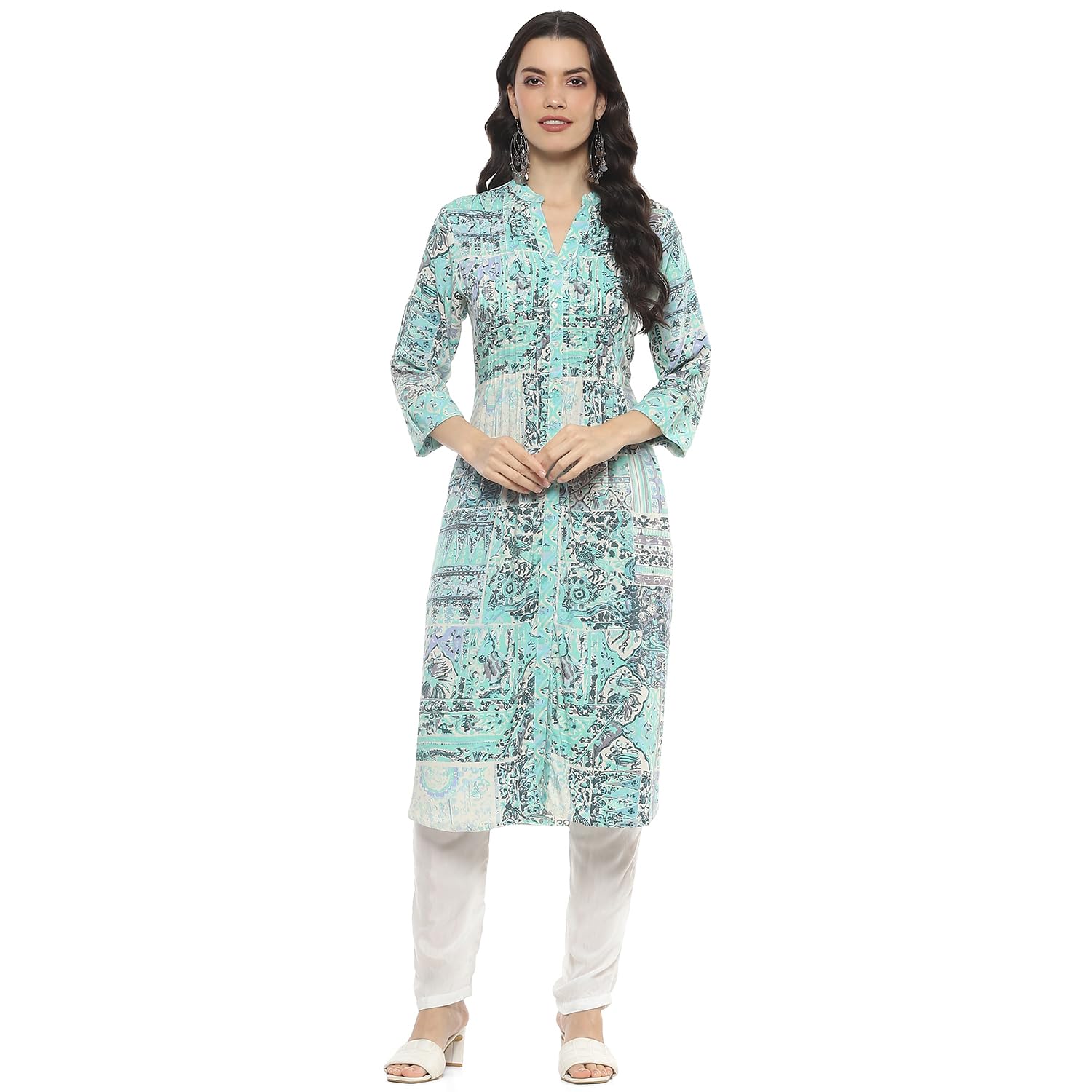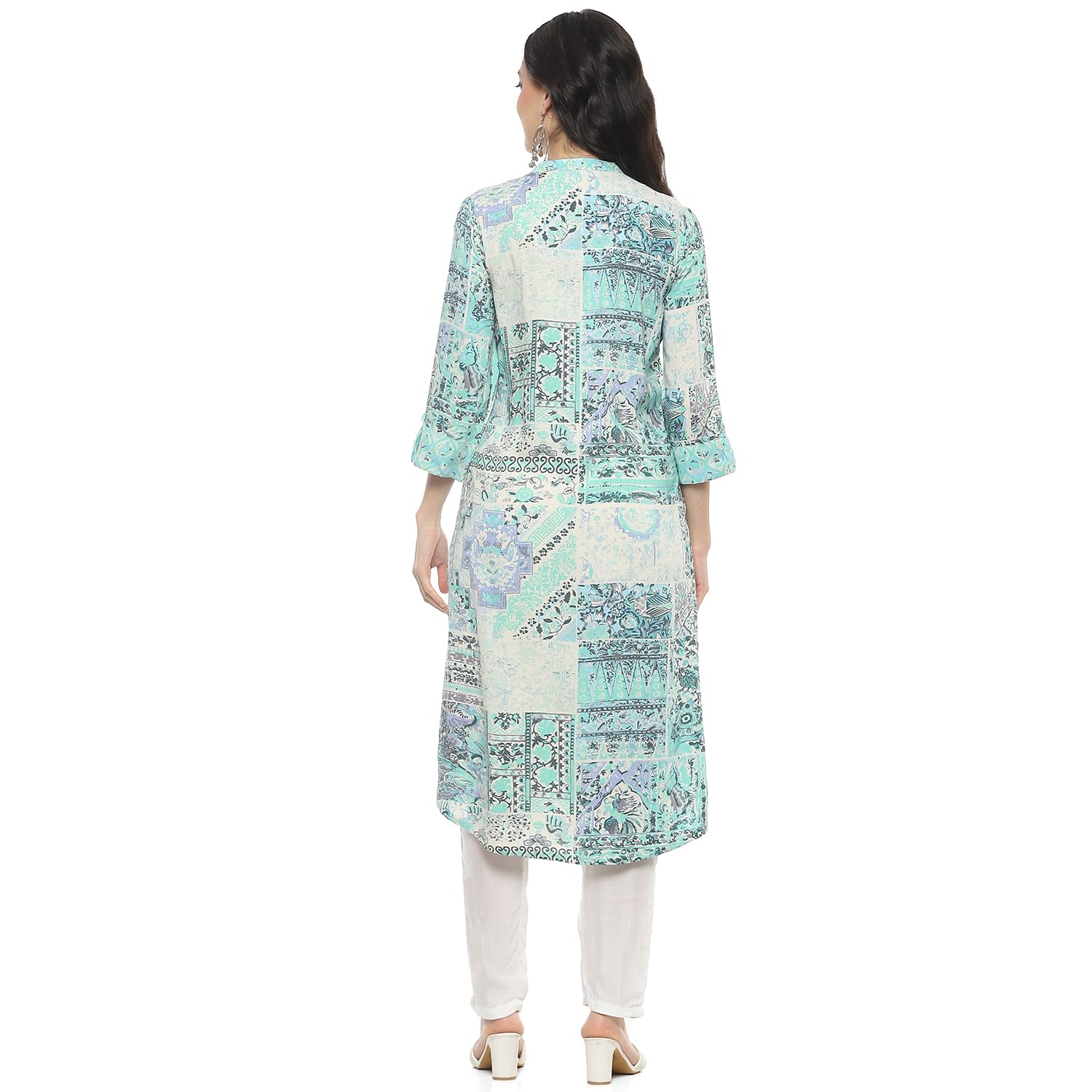 BIBA Regular Women Viscose Printed Kurti (SANGANERPATCHWORK20153SS24MINTBLU_Blue