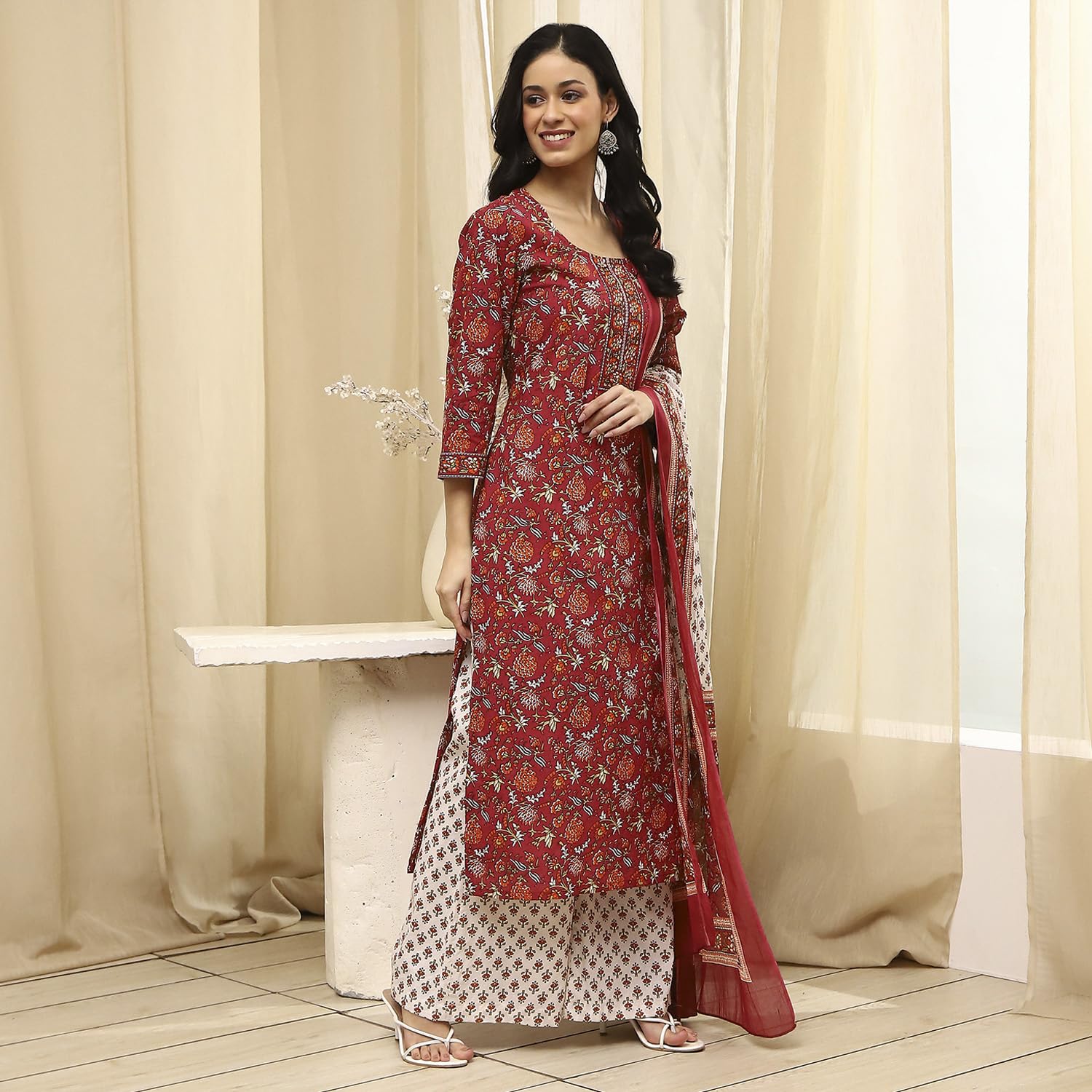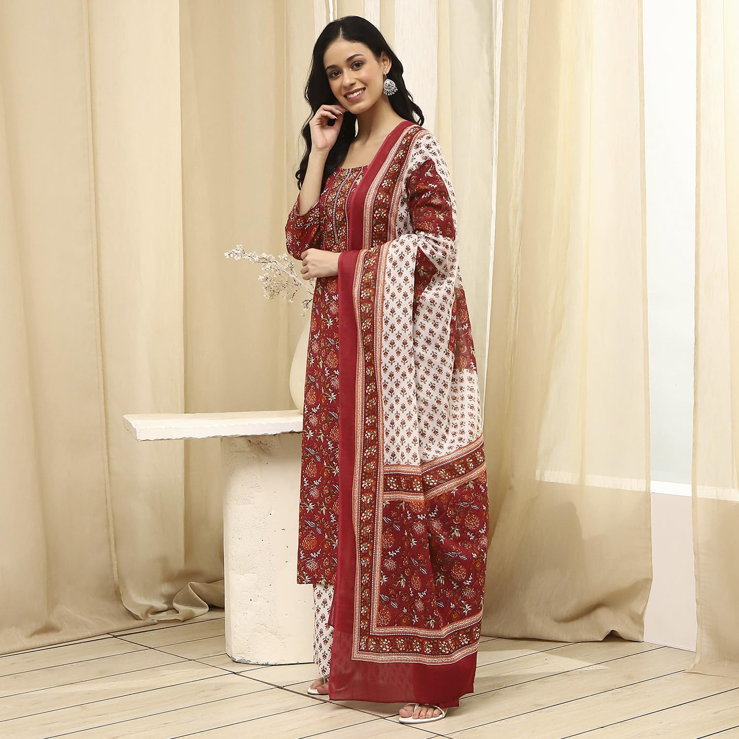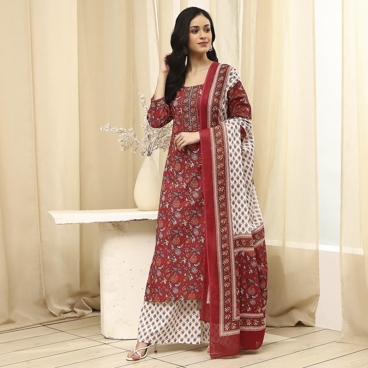 Biba Women Brown Cotton Screen Print Unstitched Suit Set