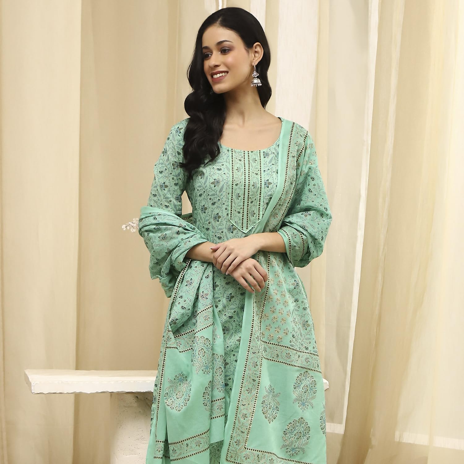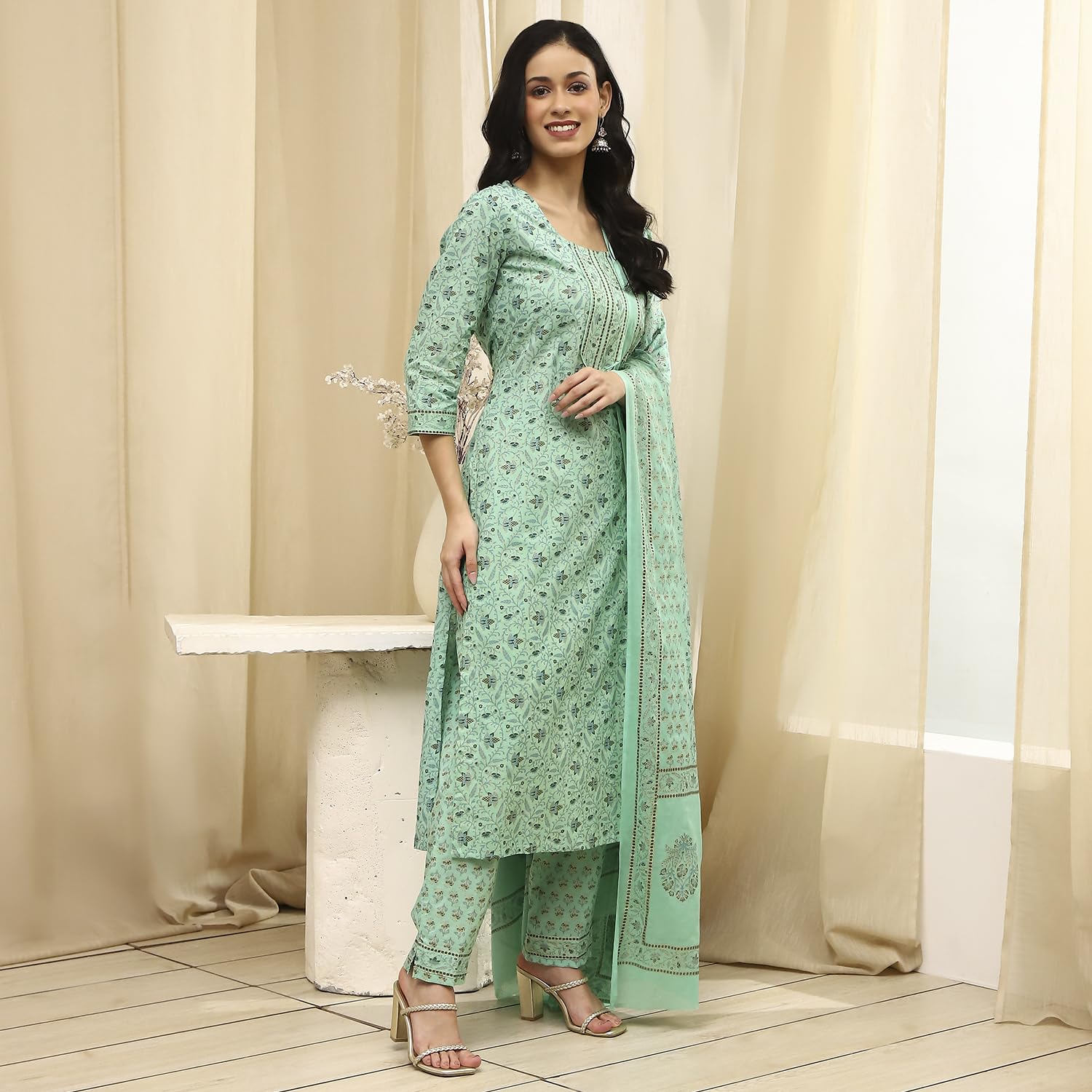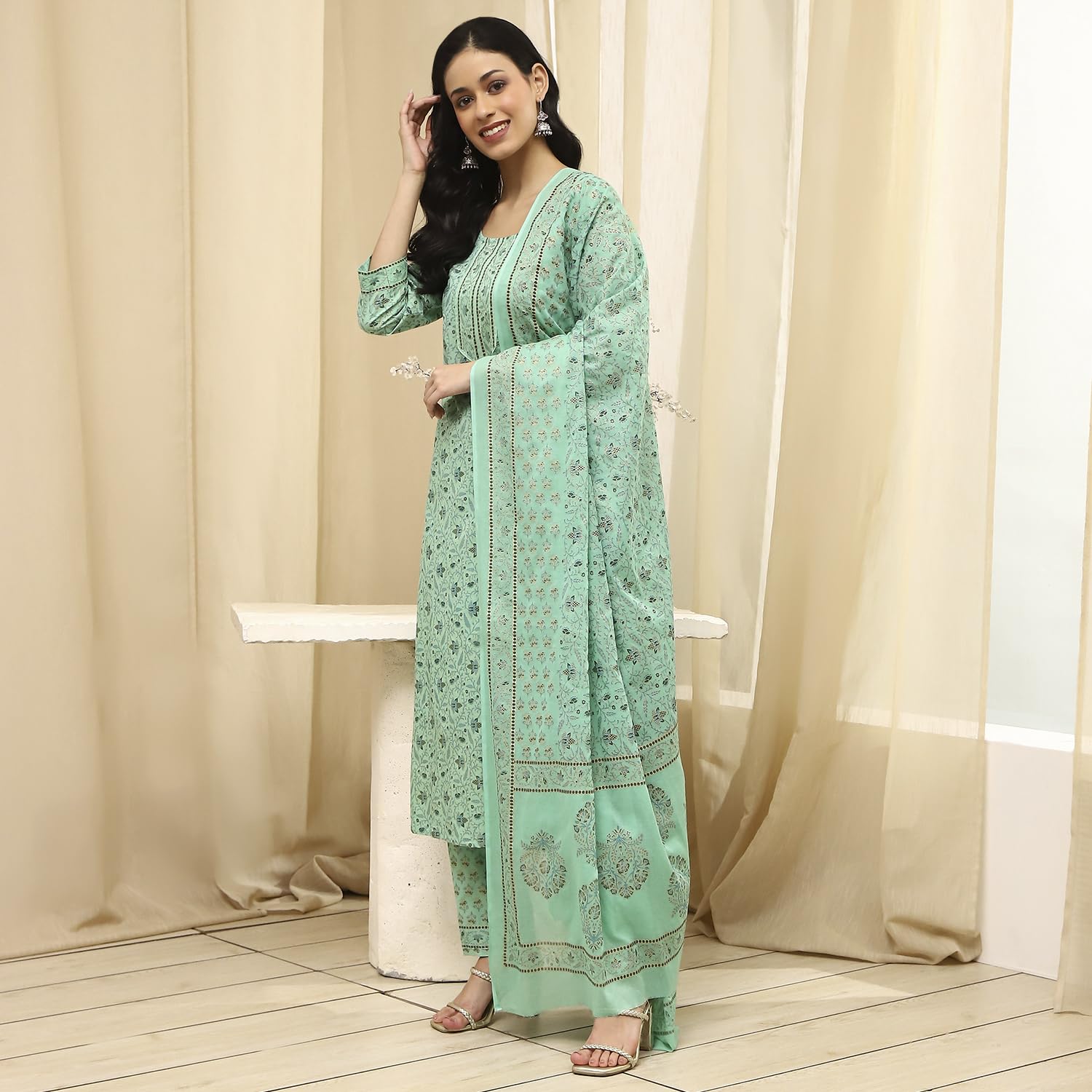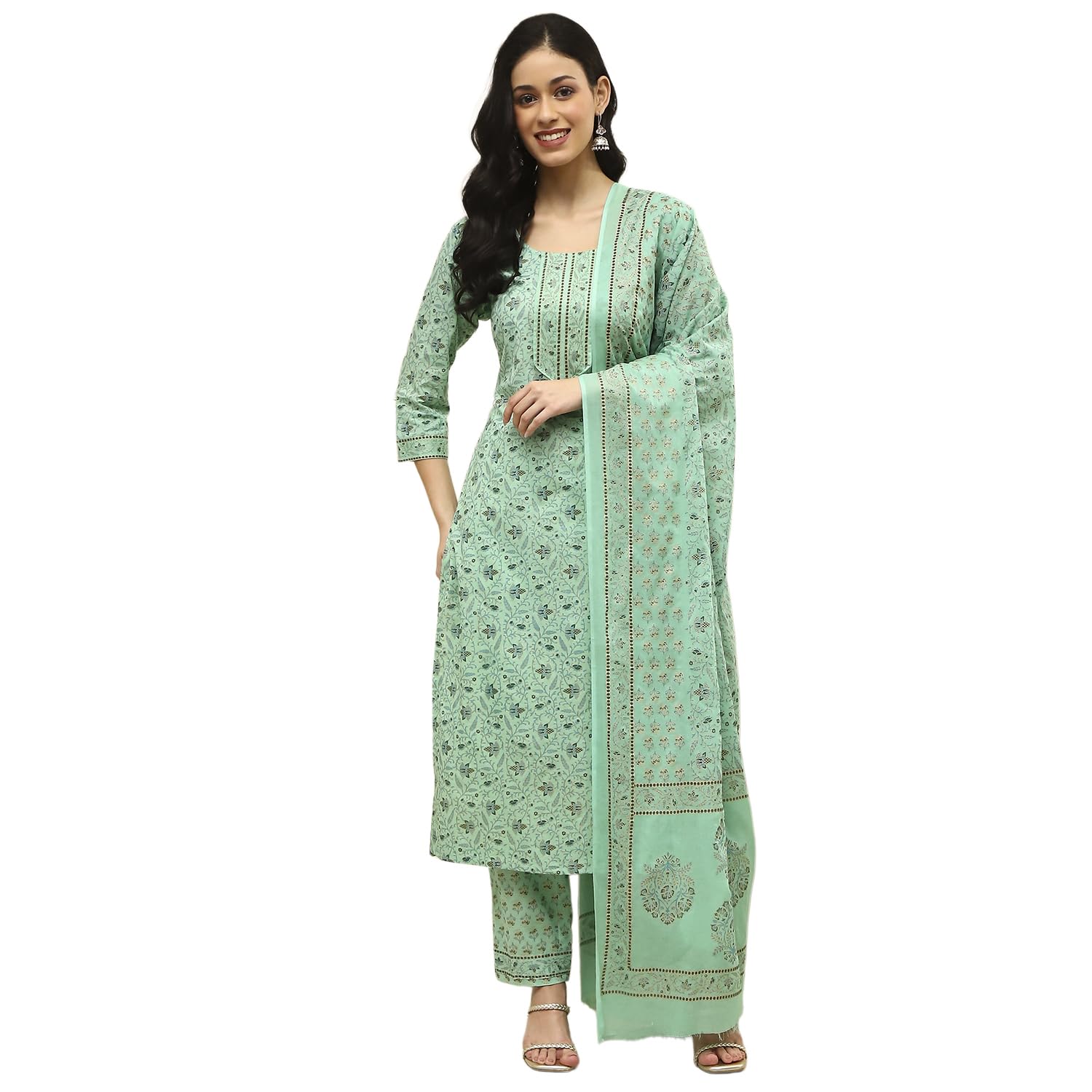 BIBA Women Green Cotton Screen Print Unstitched Suit Set_FREE SIZE