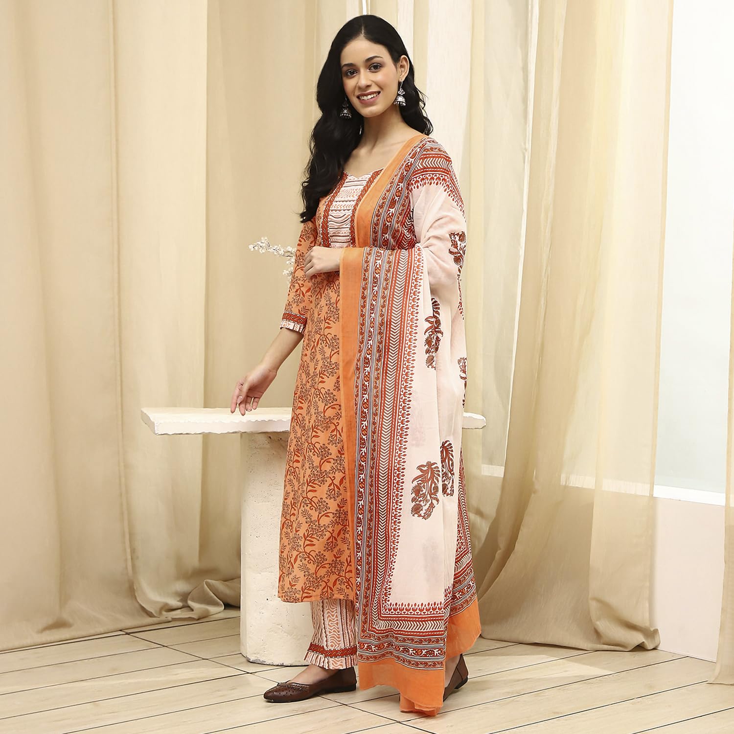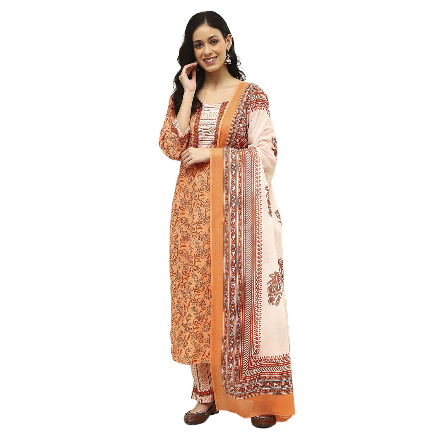 BIBA Women Peach Cotton Screen Print Unstitched Suit Set_FREE SIZE