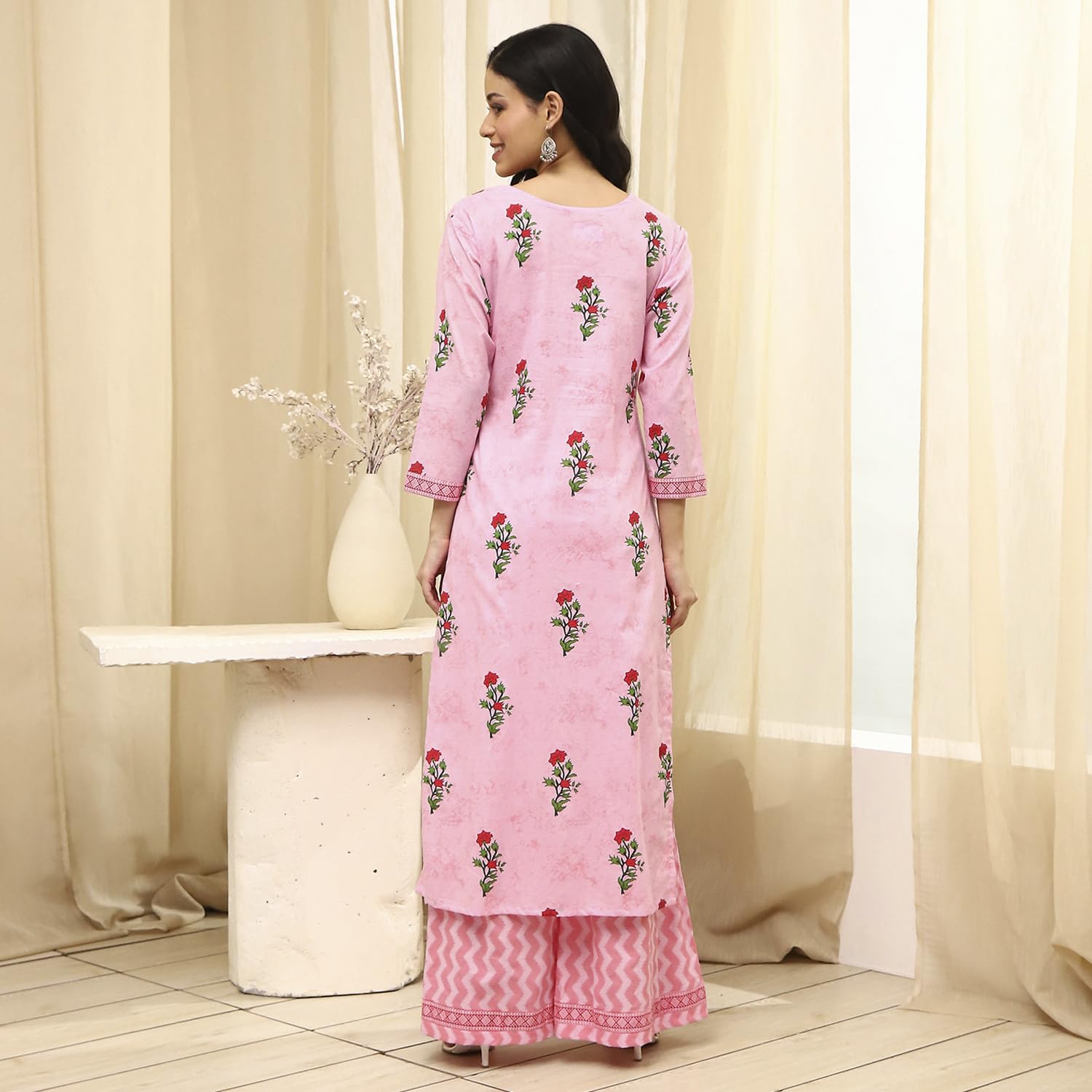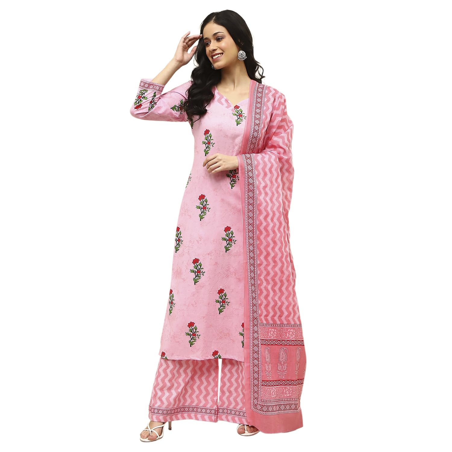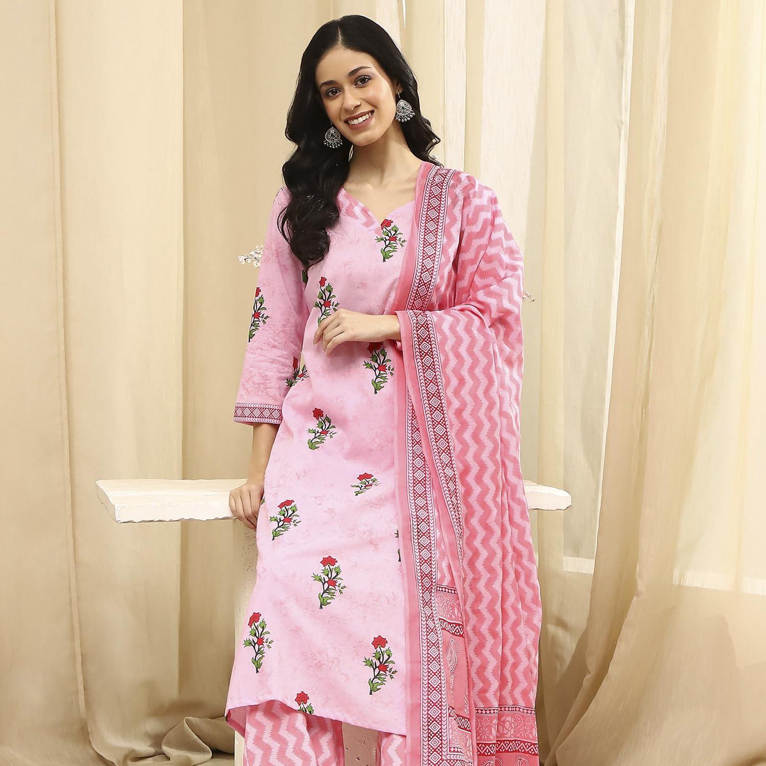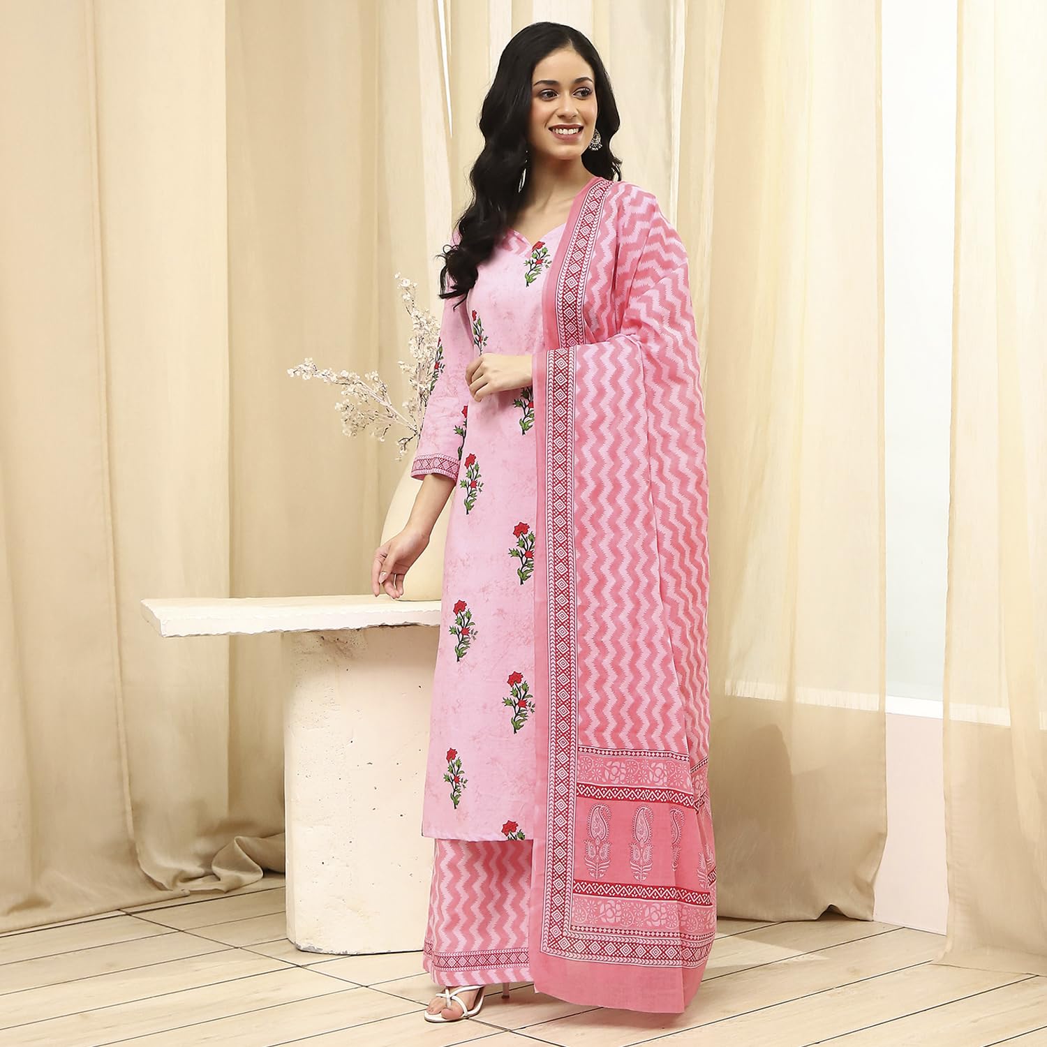 BIBA Women Pink Cotton Screen Print Unstitched Suit Set_FREE SIZE