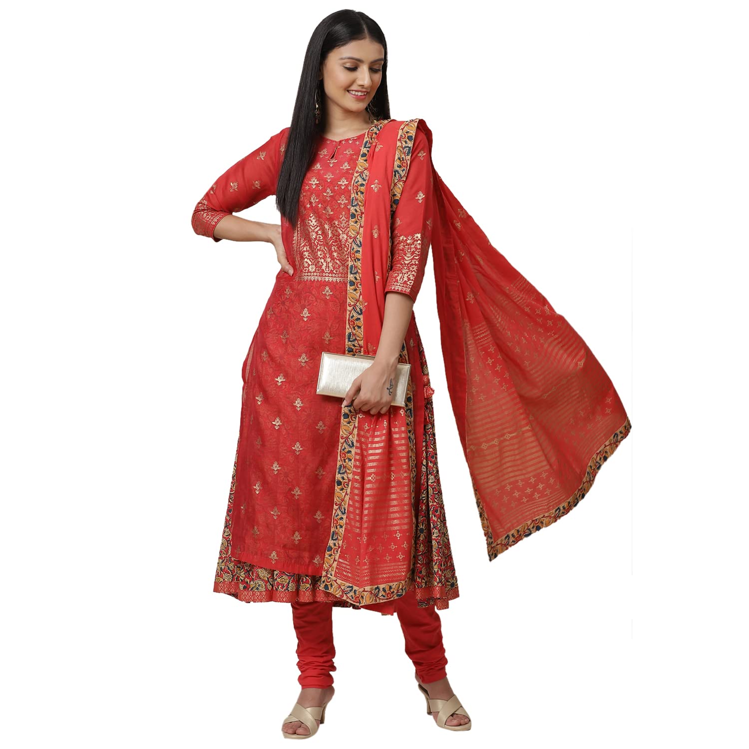 BIBA Women Printed Fitted Polyester Salwar Kurta Dupatta(Skddurgotsa7567_Red_34)