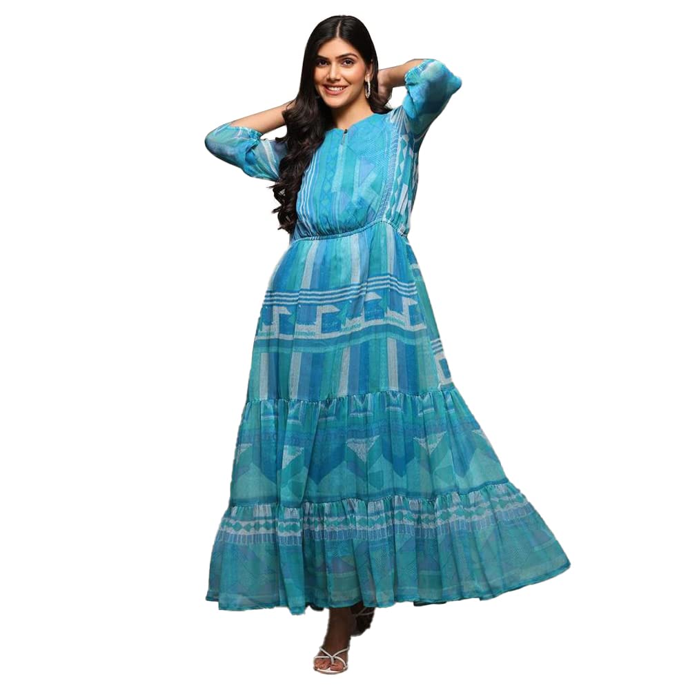 BIBA Women's Blue Poly Chiffon Tired Dress Dress