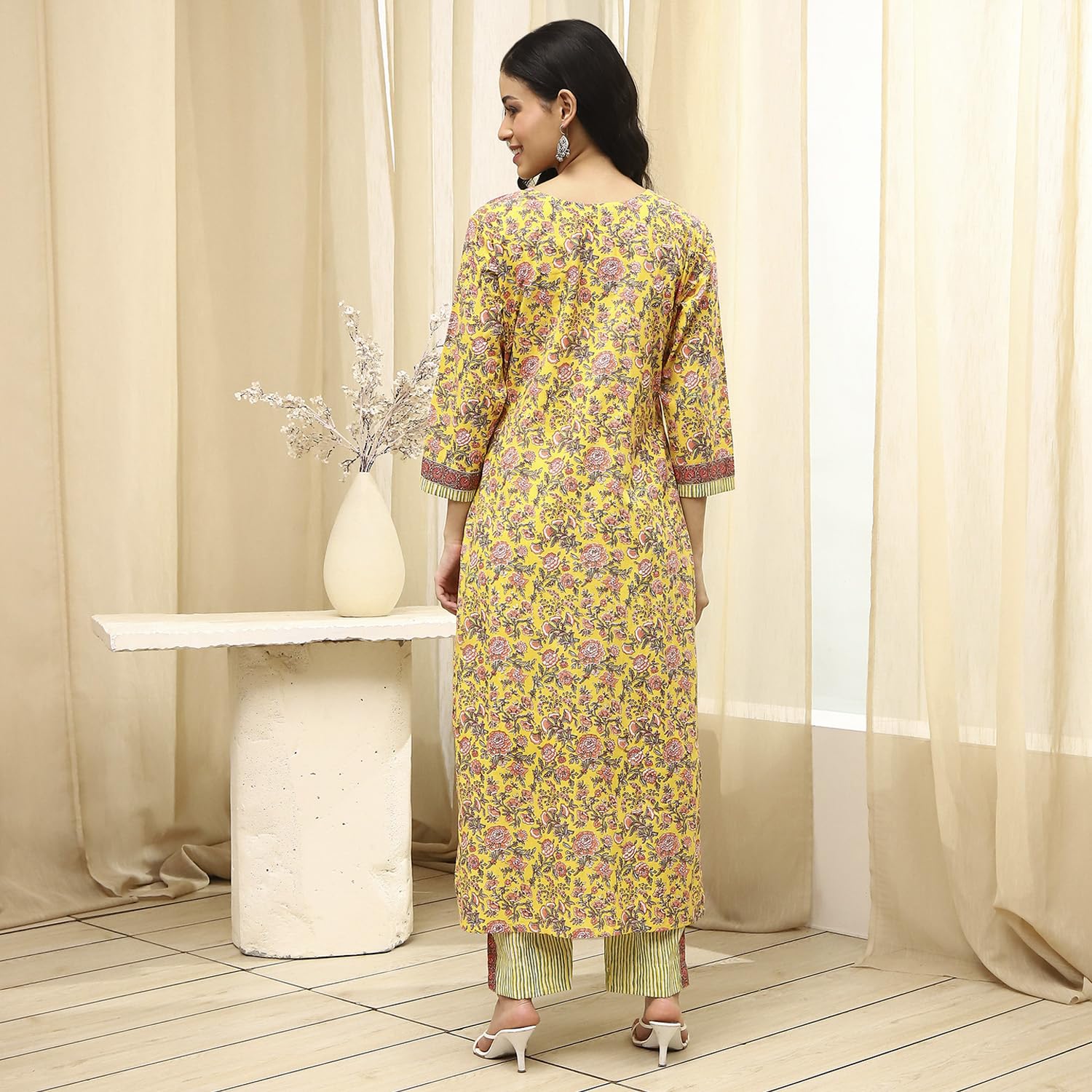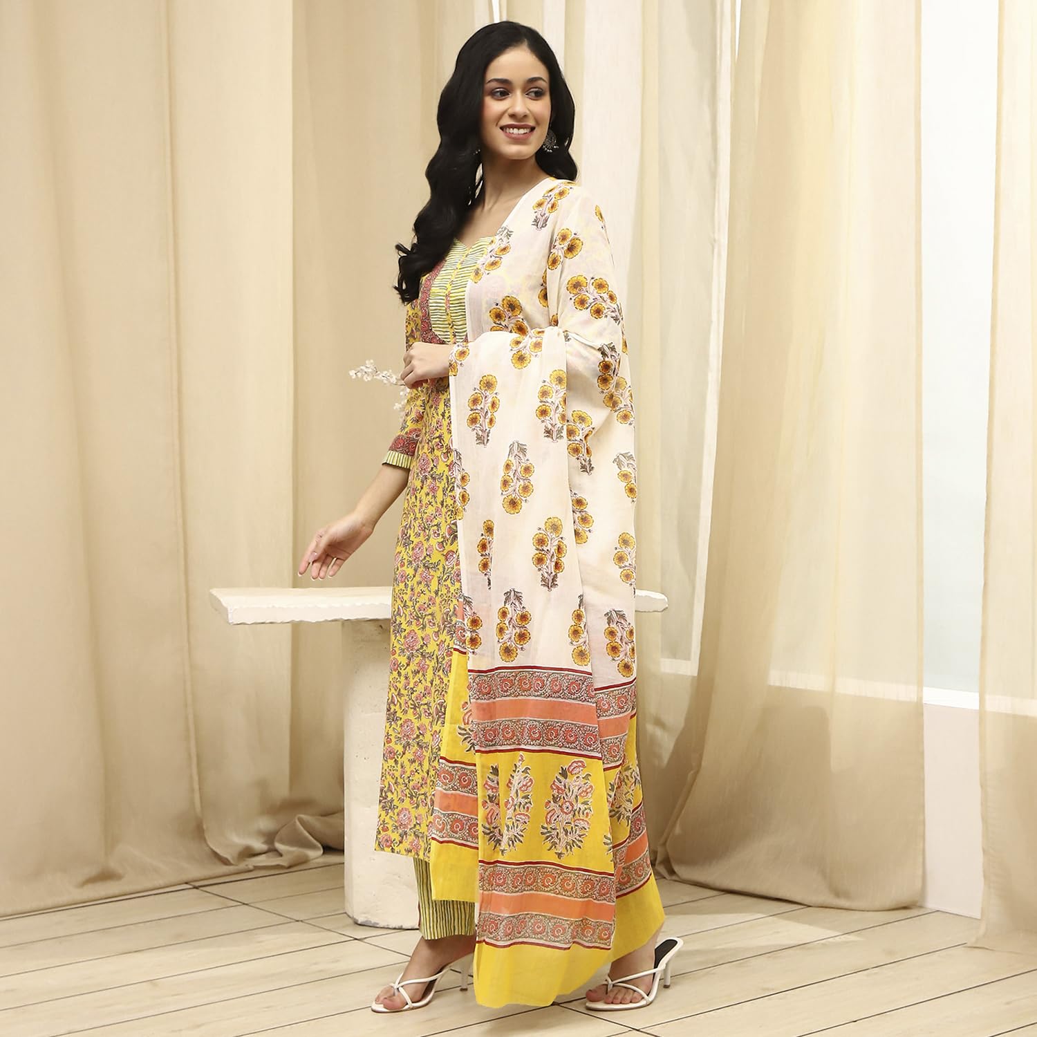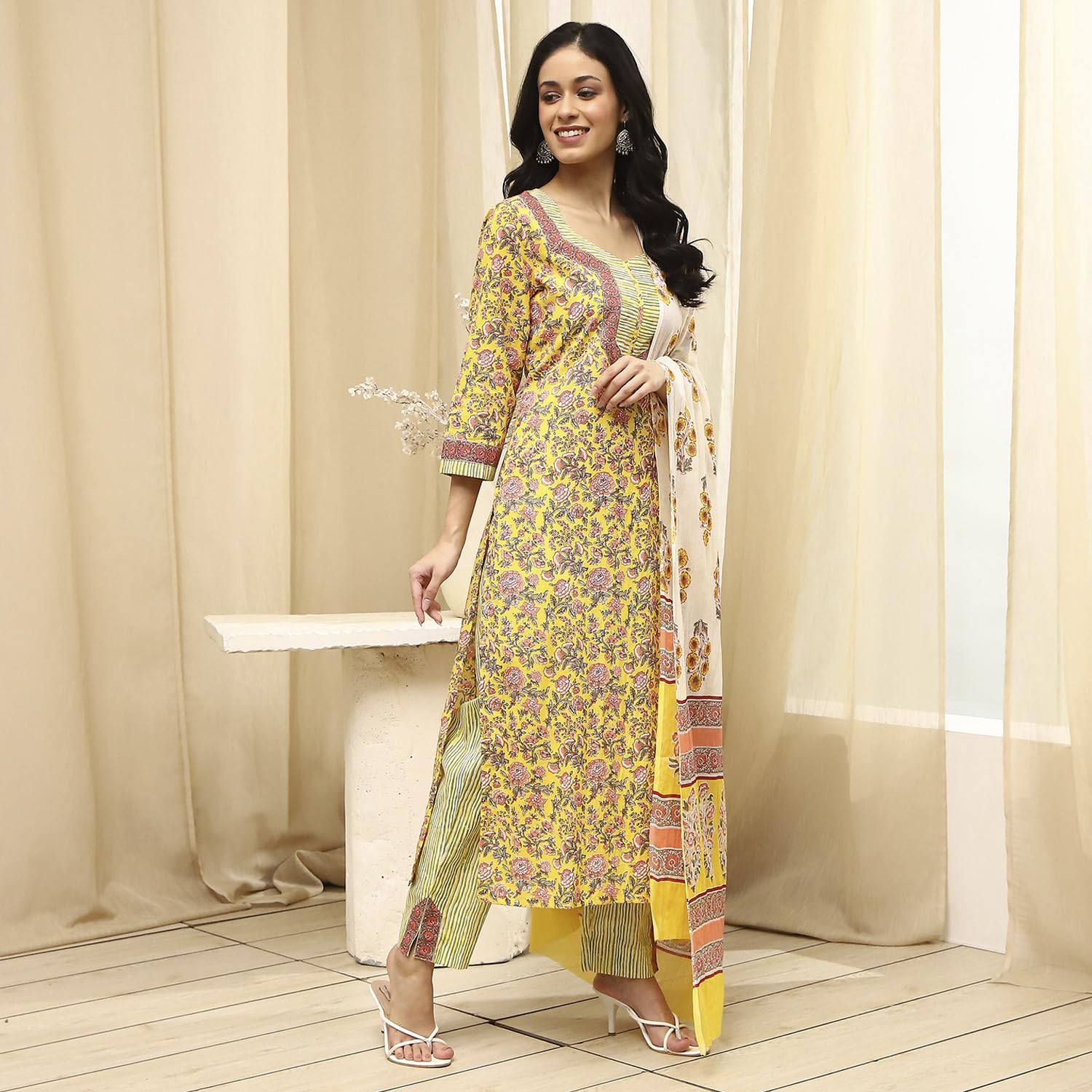Biba Women Yellow Cotton Screen Print Unstitched Suit Set