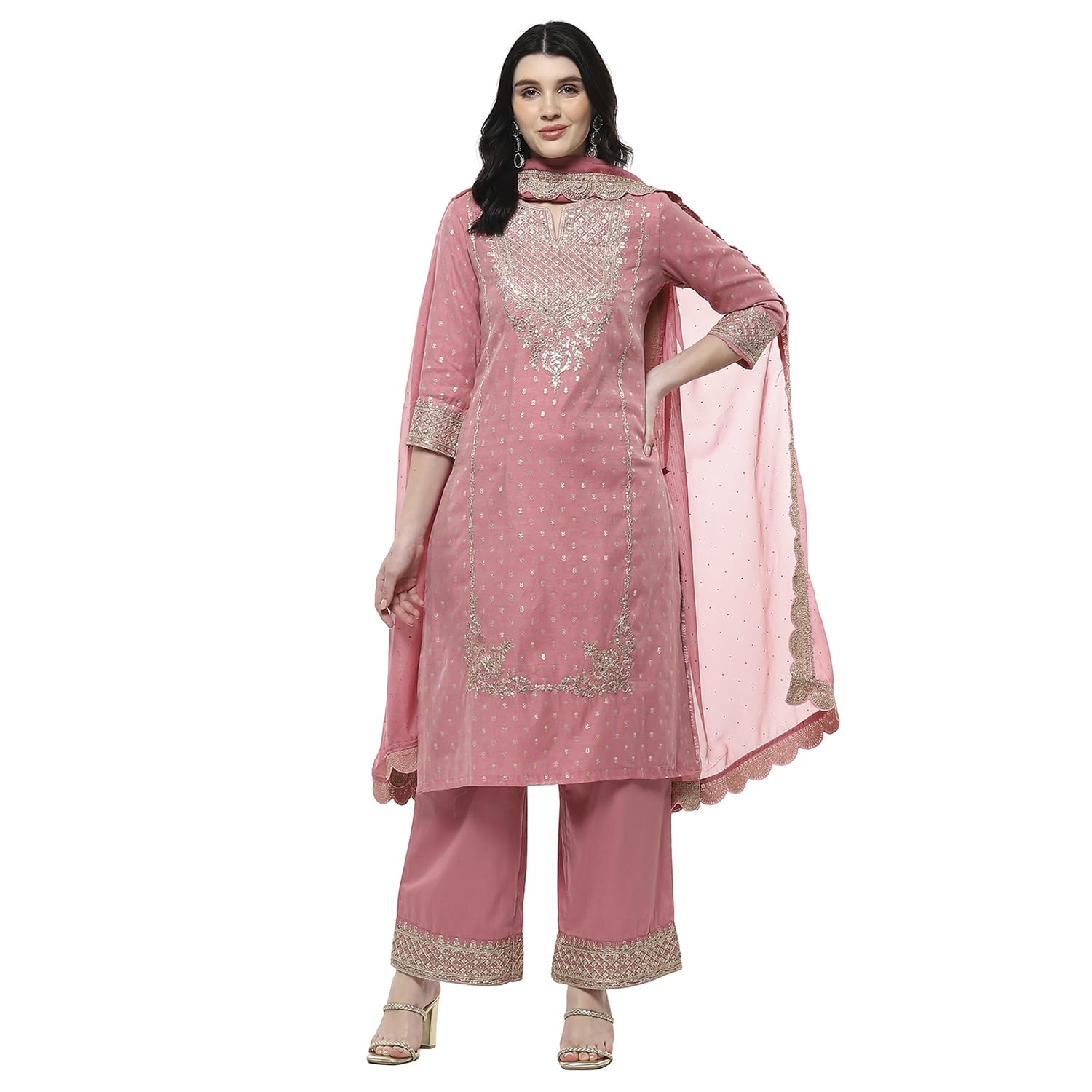 Biba Women's Polyester Kurta Set (SKDMEWAR10866SS25POWPNK_Powder Pink