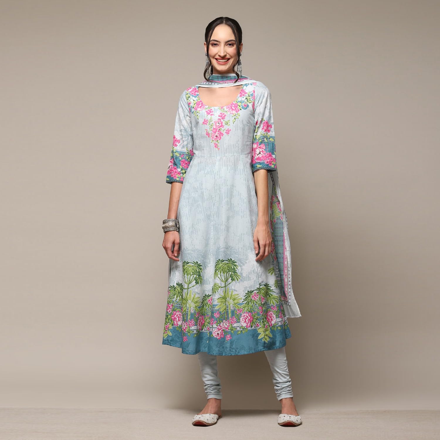 Embrace the allure of traditional Indian fashion with the Powder Blue Cotton Printed Anarkali Kurta Churidar Suit Set. This set features a floral printed Anarkali kurta, Churidar bottoms, and a matching dupatta, all crafted with elegance and comfort in mind. Made from high-quality flex fabric, it exudes ethereal charm and is perfect for casual occasions. Pair it with Kolhapuri sandals and oxidised jewelry for a captivating ensemble that will leave a lasting impression.