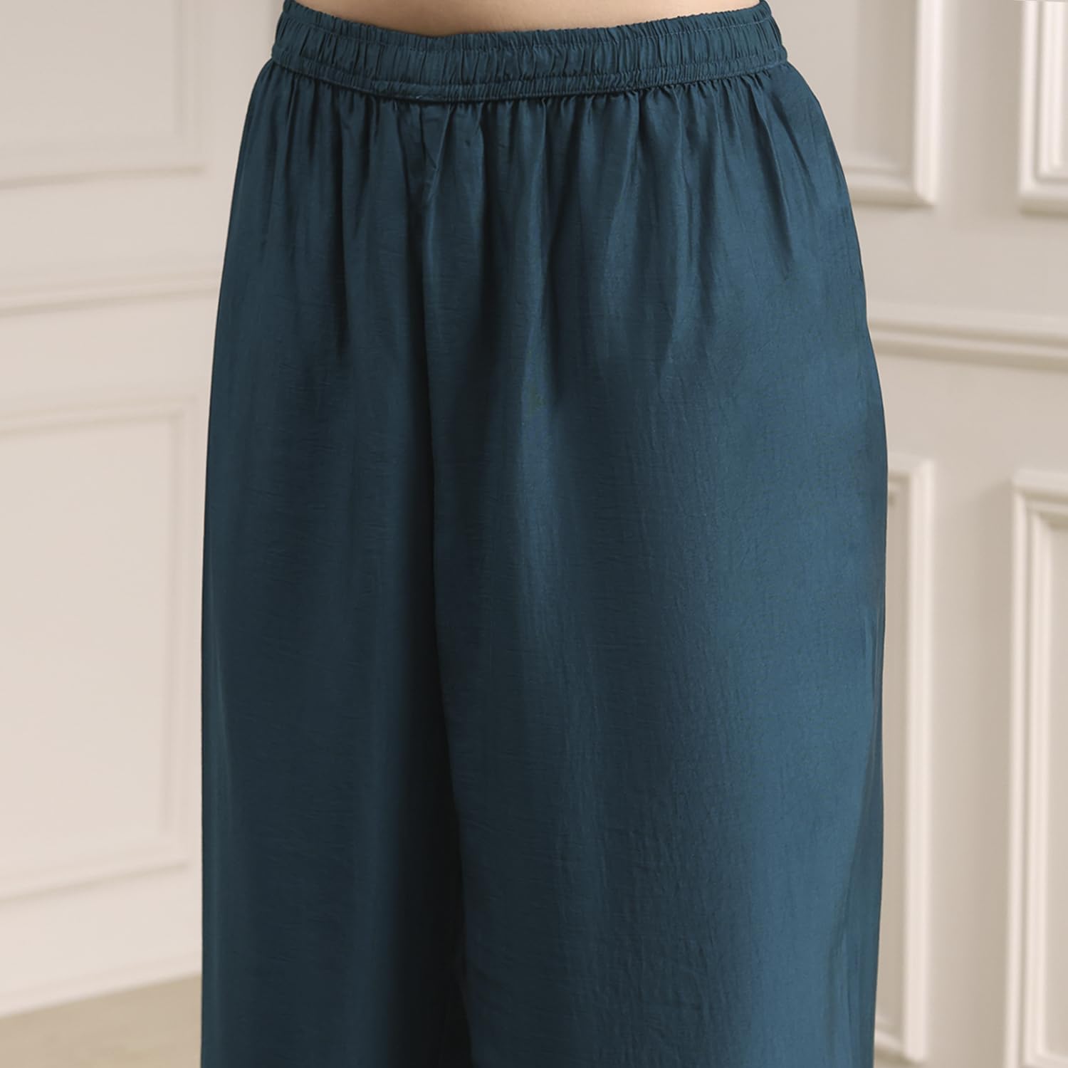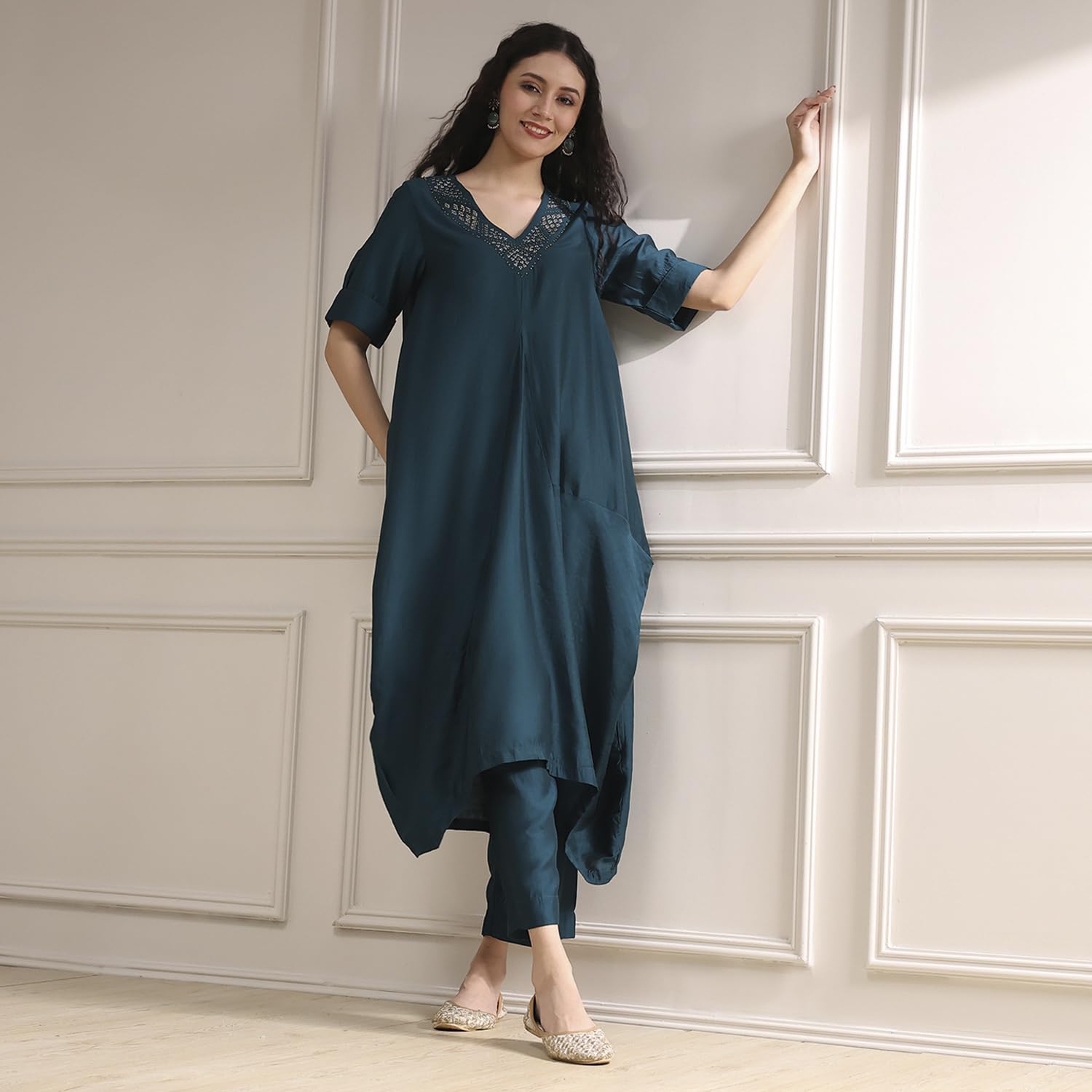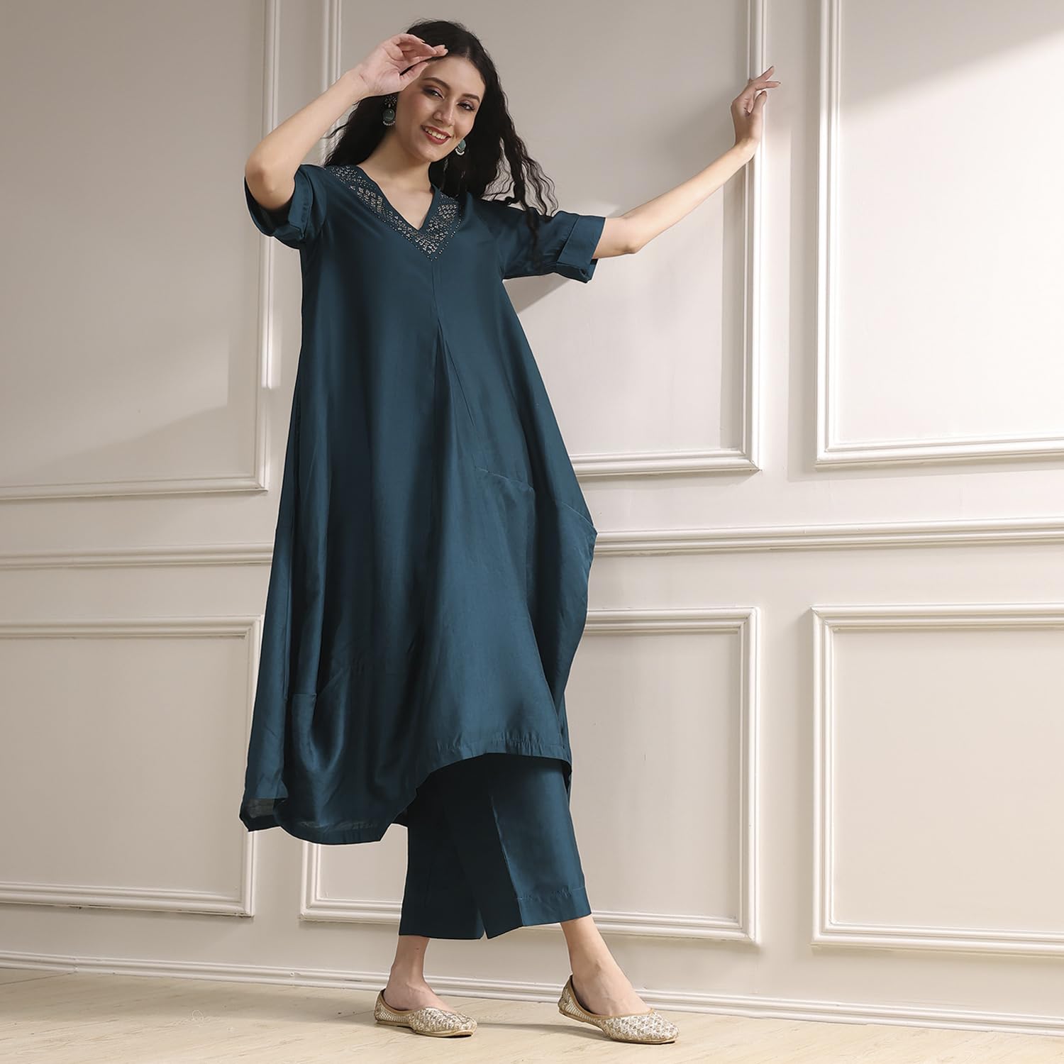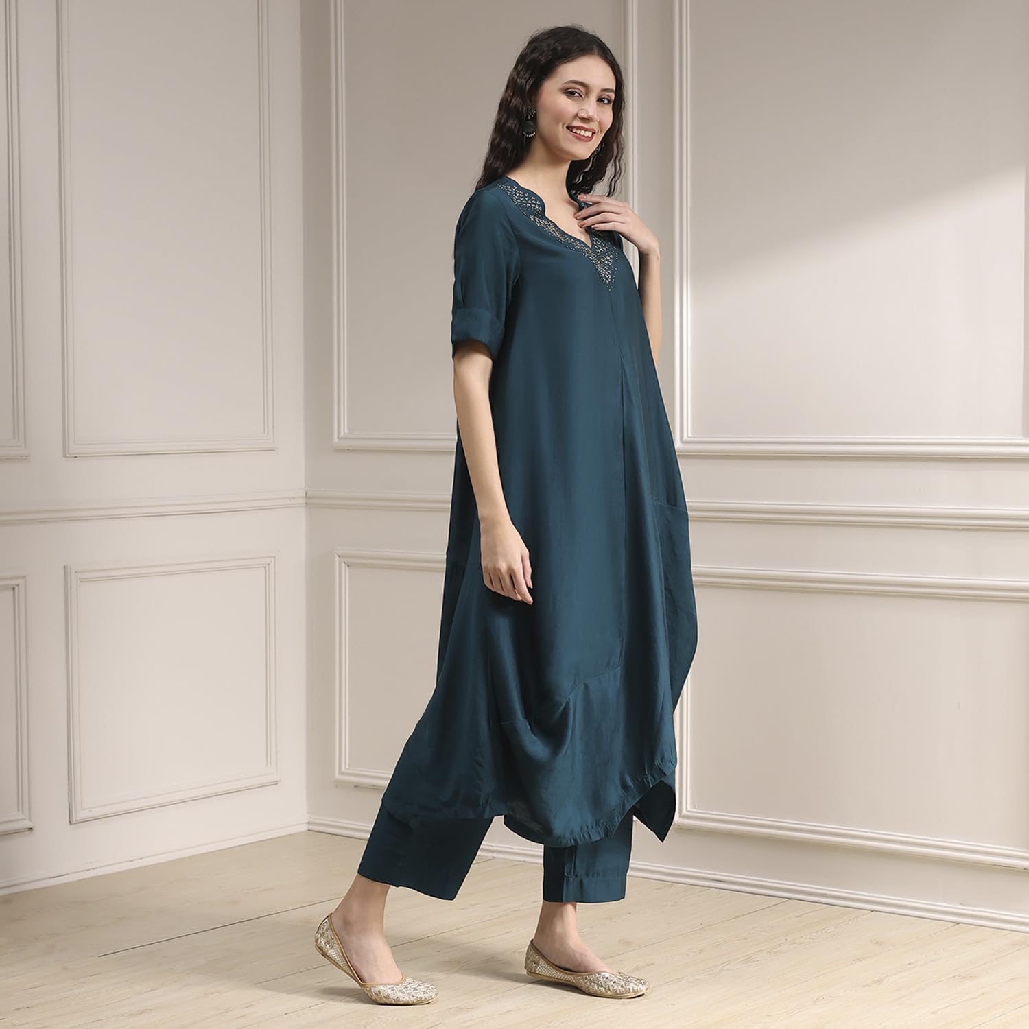 Biba Women Teal Blue Viscose Blend Asymmetric Dyed Kurta Set