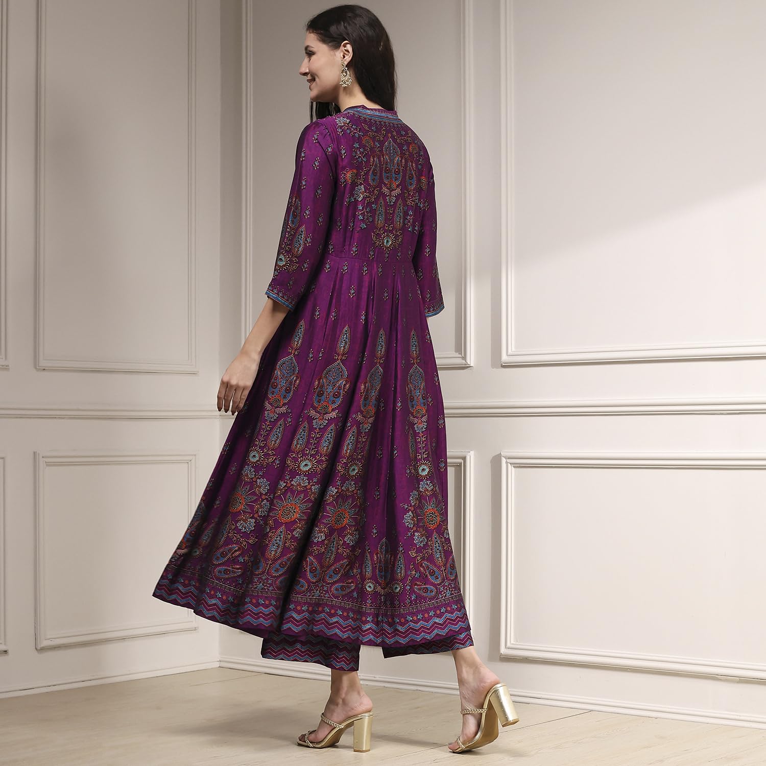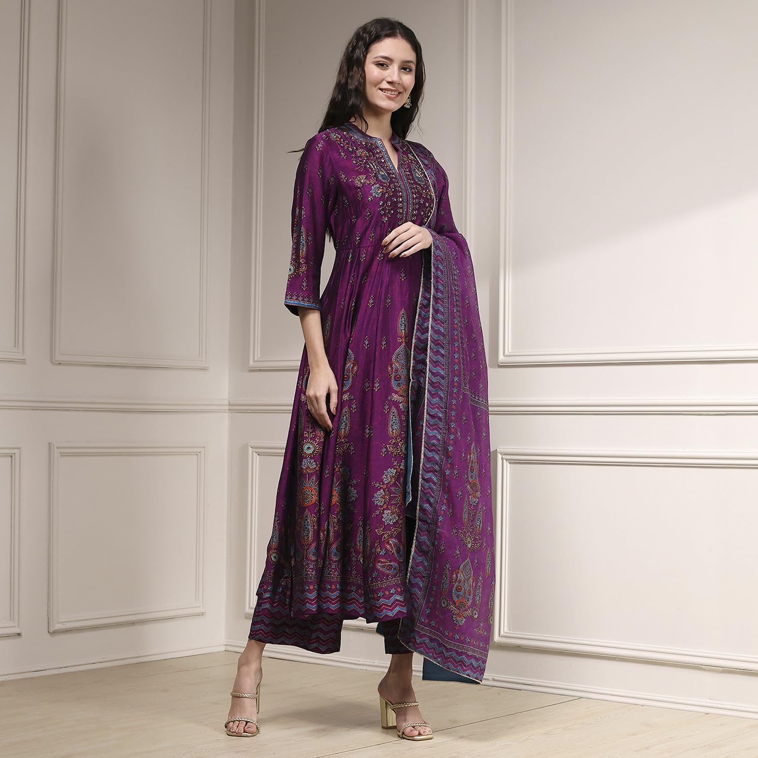 Purple Viscose Kalidar Printed Suit Set