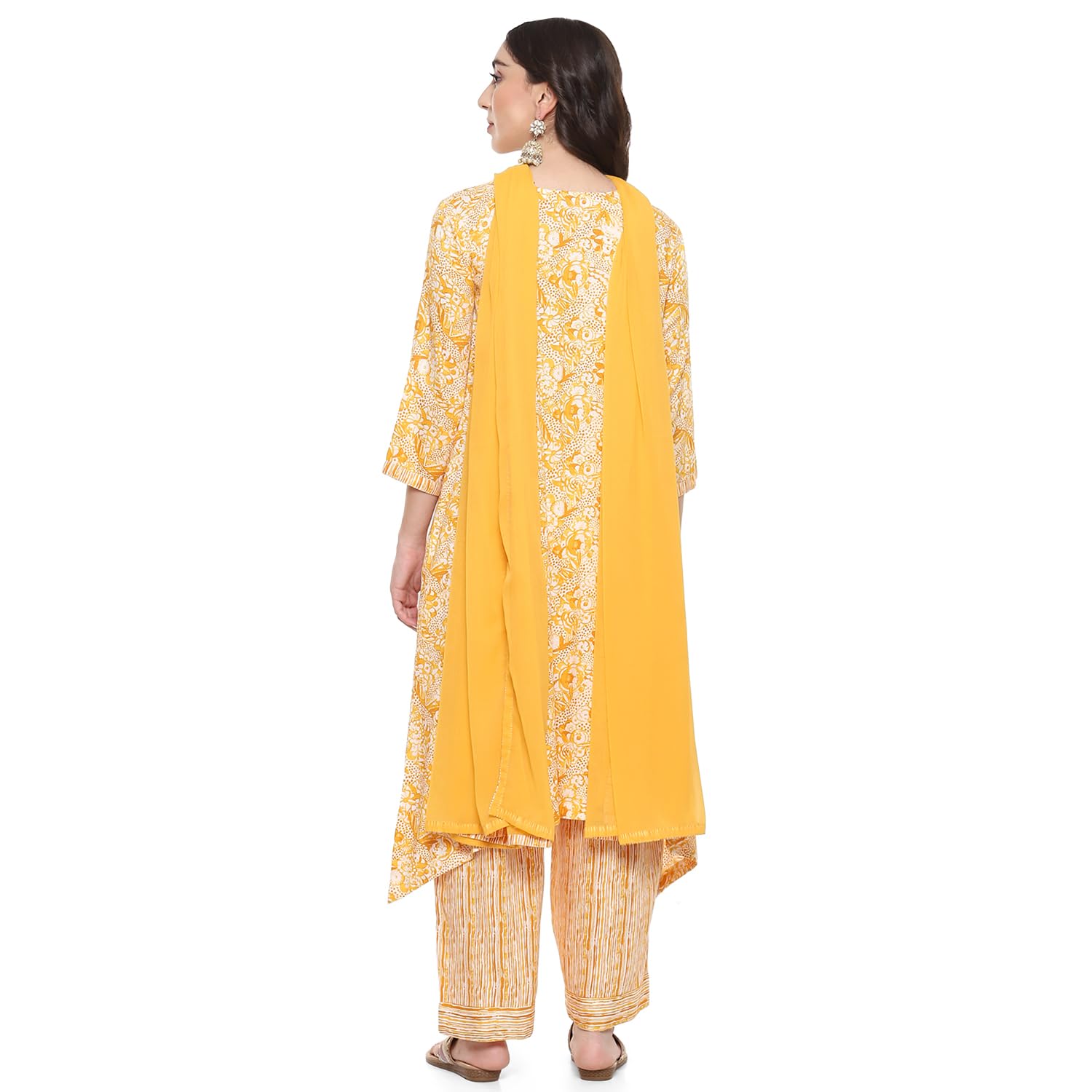 BIBA Women's Rayon Printed Straight Kurta Salwar Kurta Dupatta (Skd9677_Yellow_34)