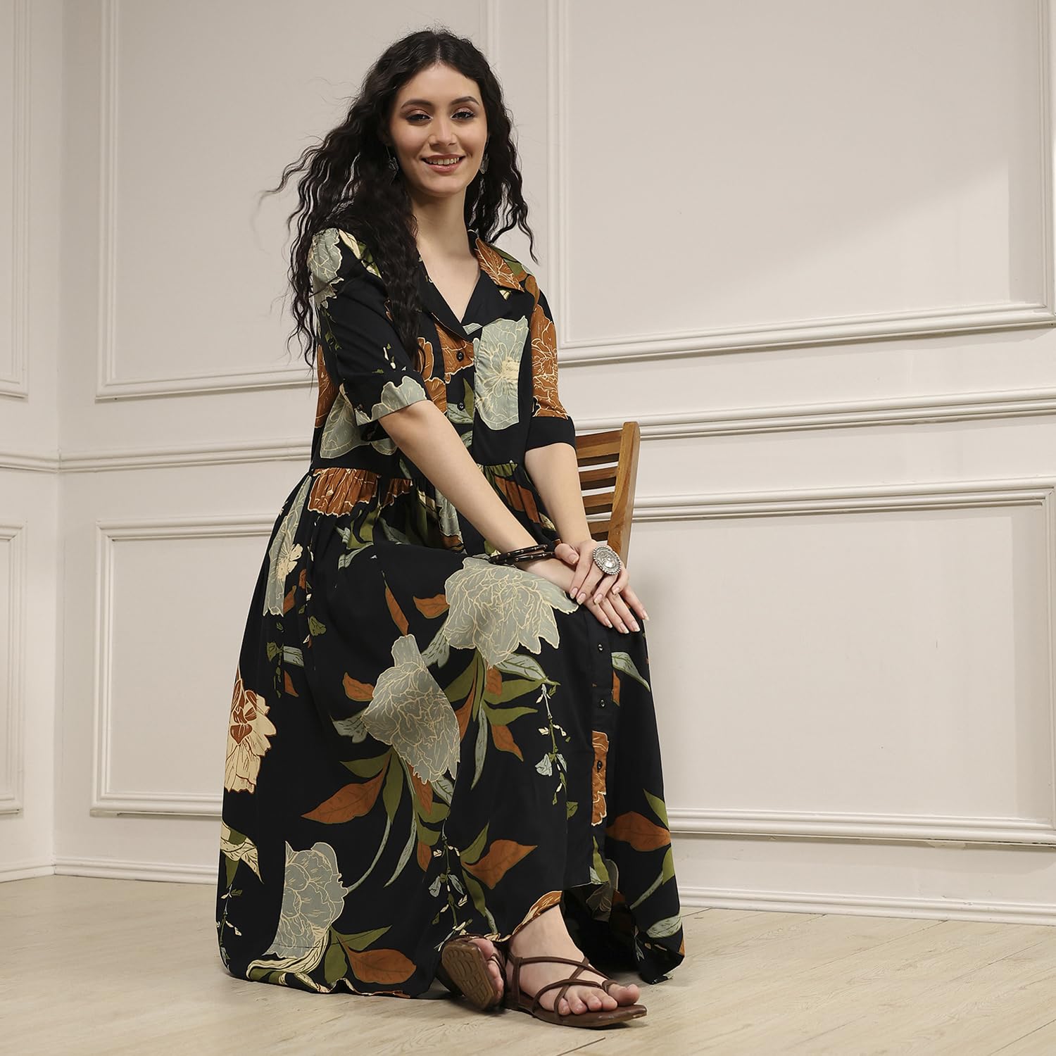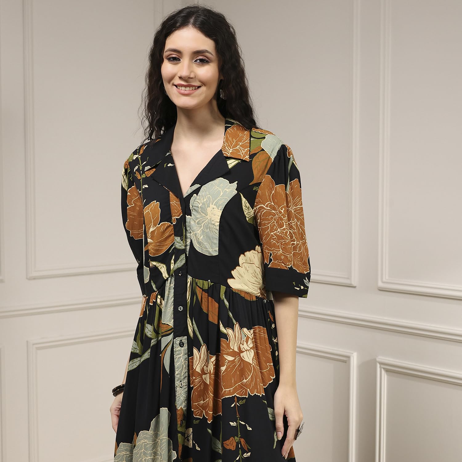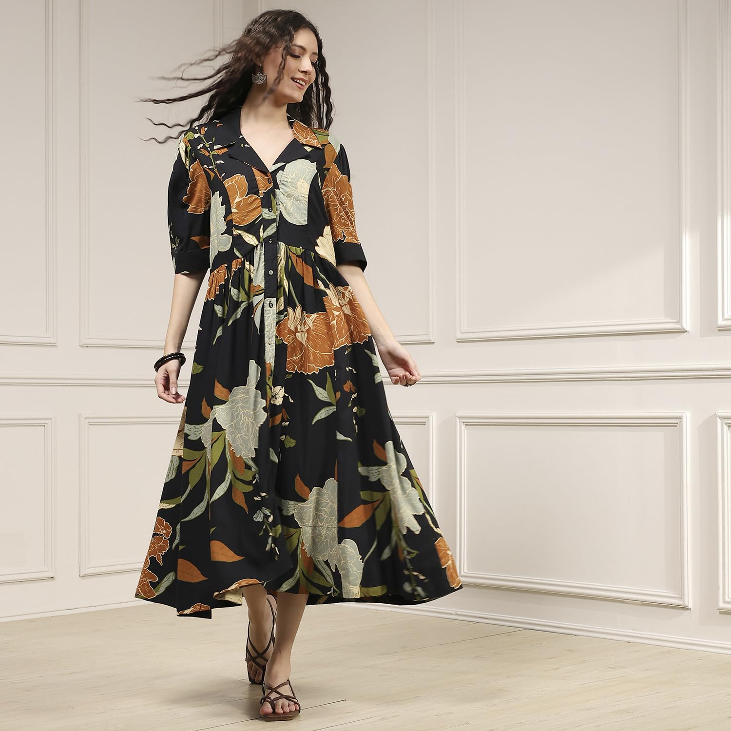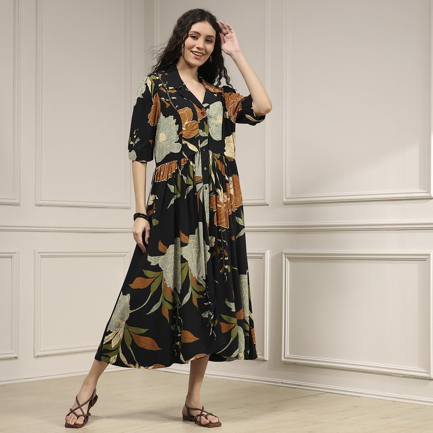 Biba Women Black Viscose Rayon Straight Printed Dress