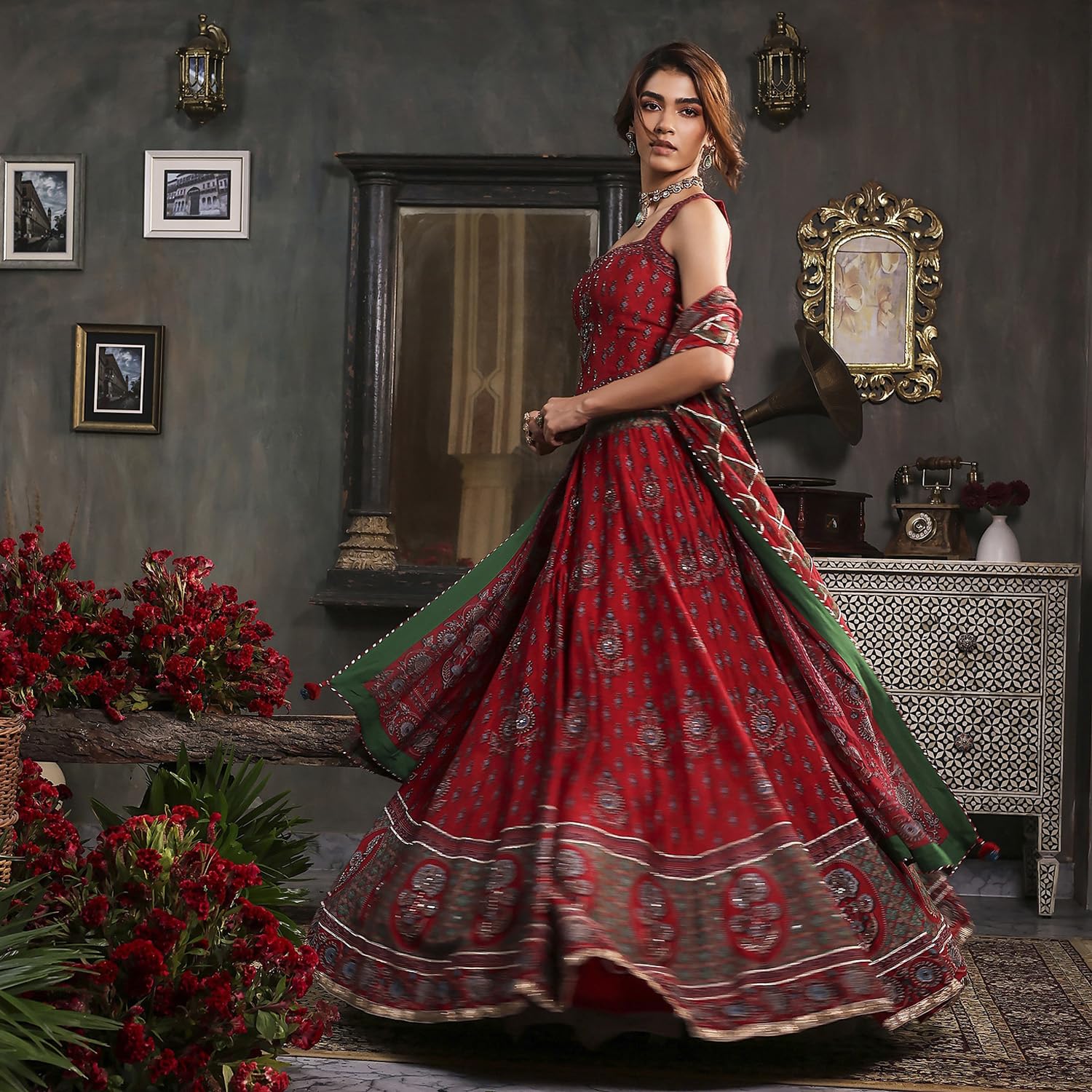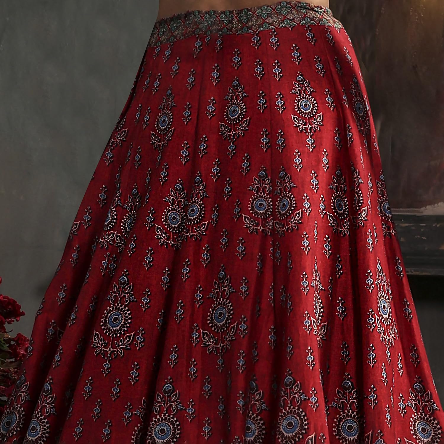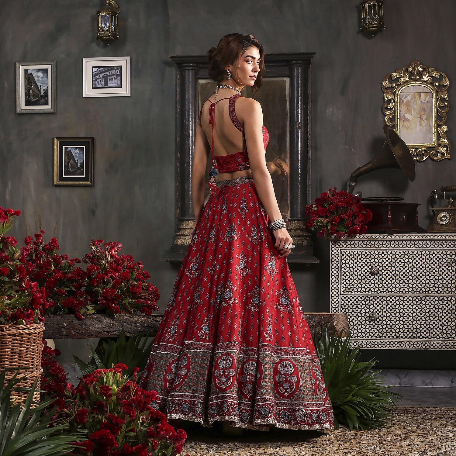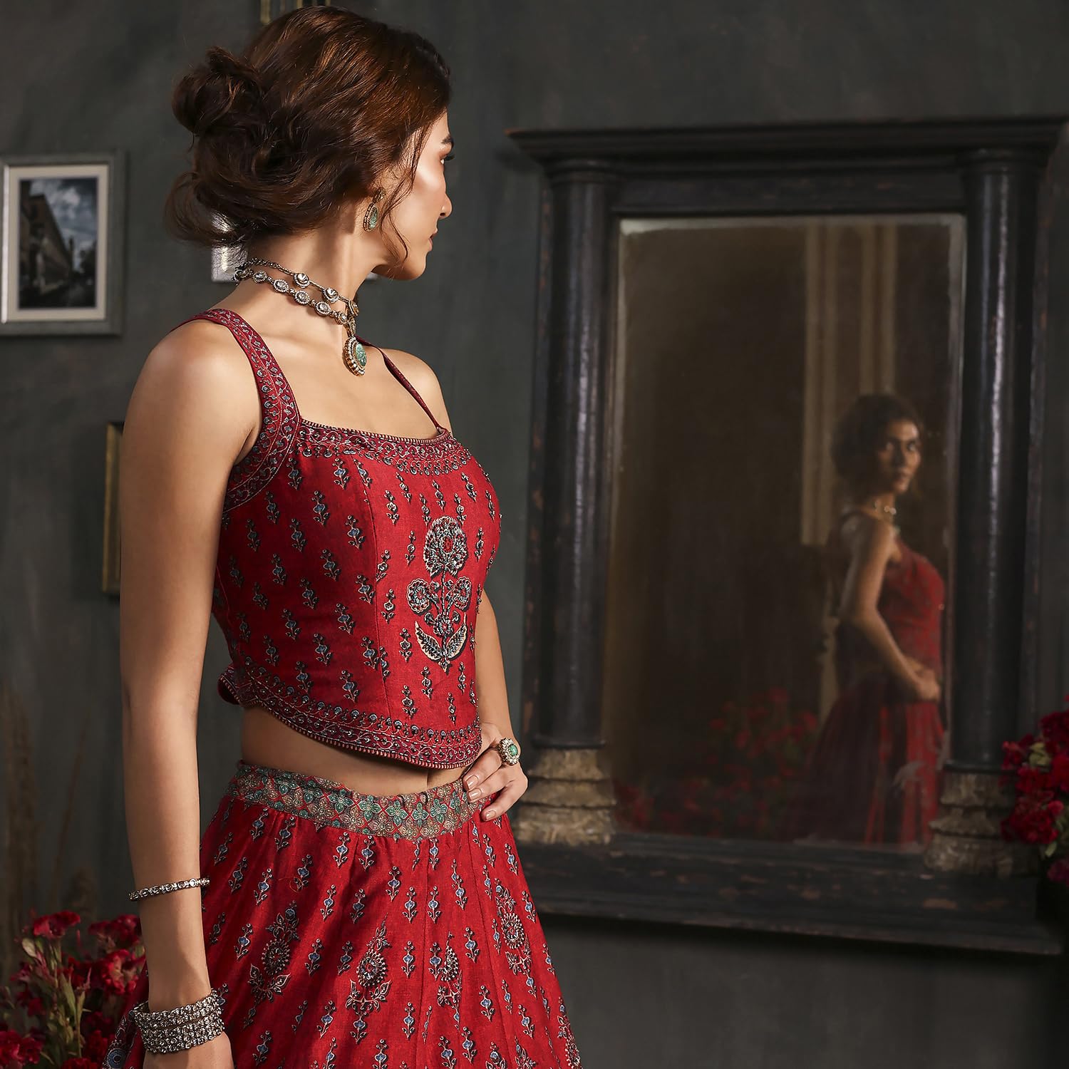 Biba Women Red Chanderi Fitted Printed Lehenga Set