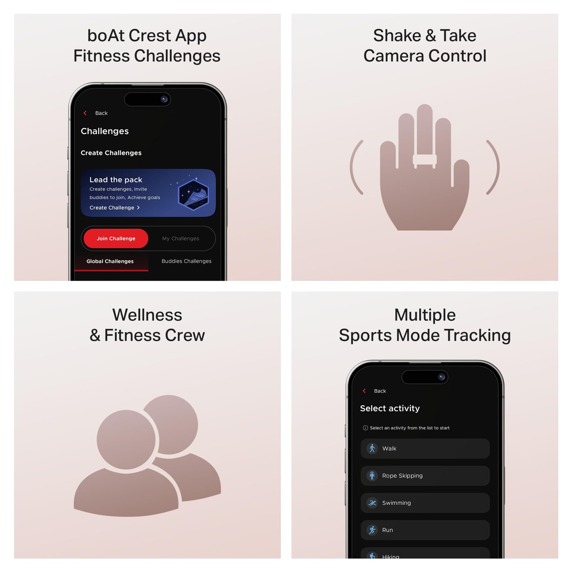 - 30 Days Battery Life with Case| 5ATM Dust, Sweat & Sweat Resistant| boAt Crest app fitness challenges| Multiple Sports Mode Tracking| Camera Control – Shake & Take