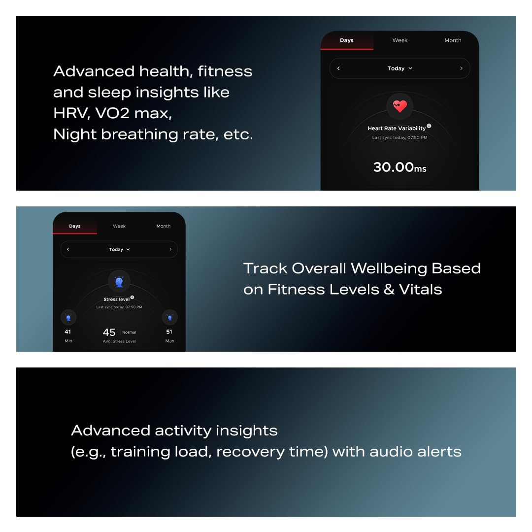 - 1.43” AMOLED Display with Gorilla Glass: The 1.43” (3.63 cm) AMOLED touchscreen comes protected with Gorilla Glass, resisting scratches and impacts while keeping your health stats sharp and visible—even under bright sunlight. With 466×466 resolution, 550 nits brightness, Wake Gesture, and Always-On Display, it ensures clear visibility and quick screen access.