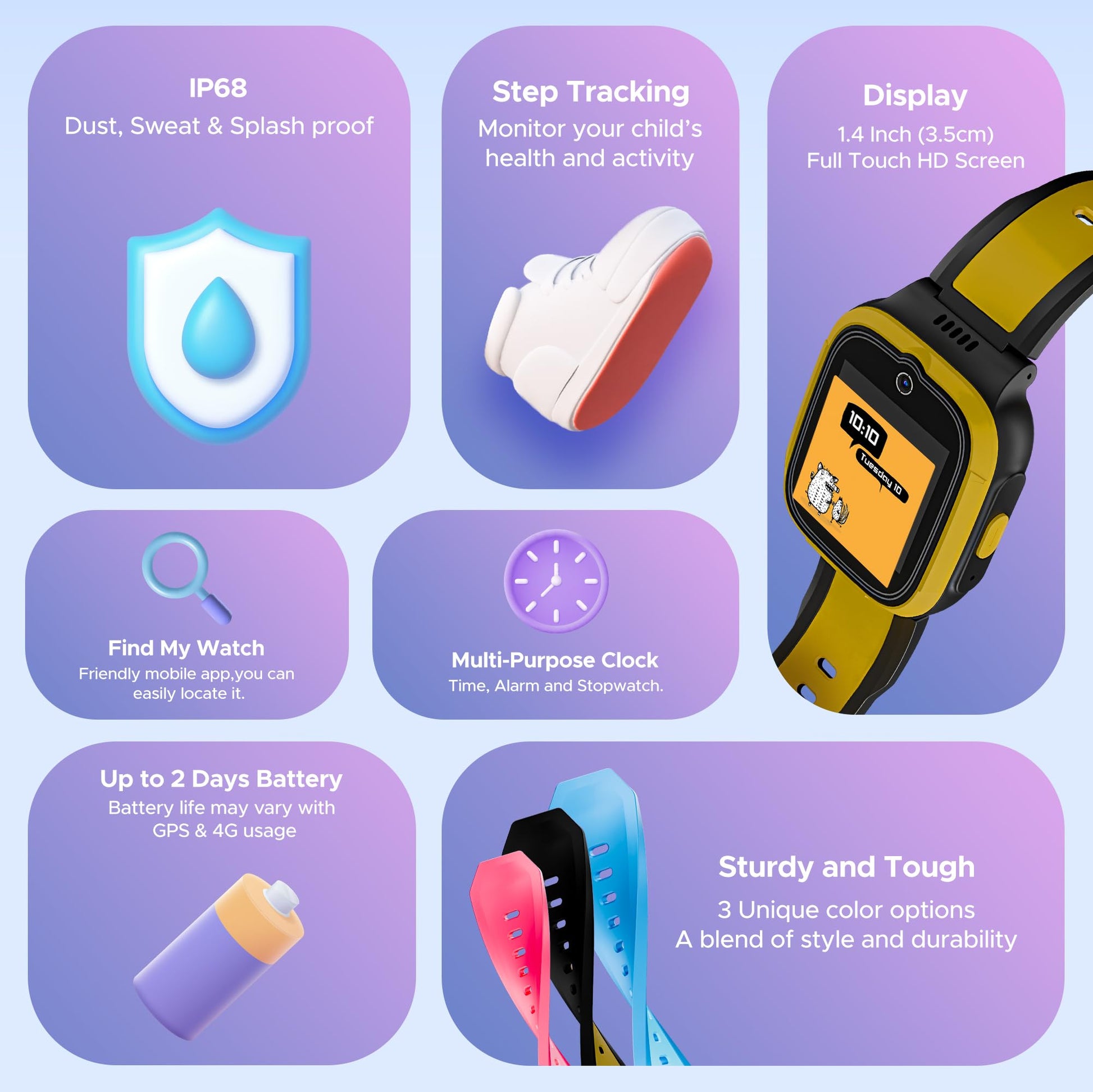 - 1.4" (3.5 cm) HD Display: Provides a bright and clear screen, perfect for kids to easily see and use the smartwatch.
