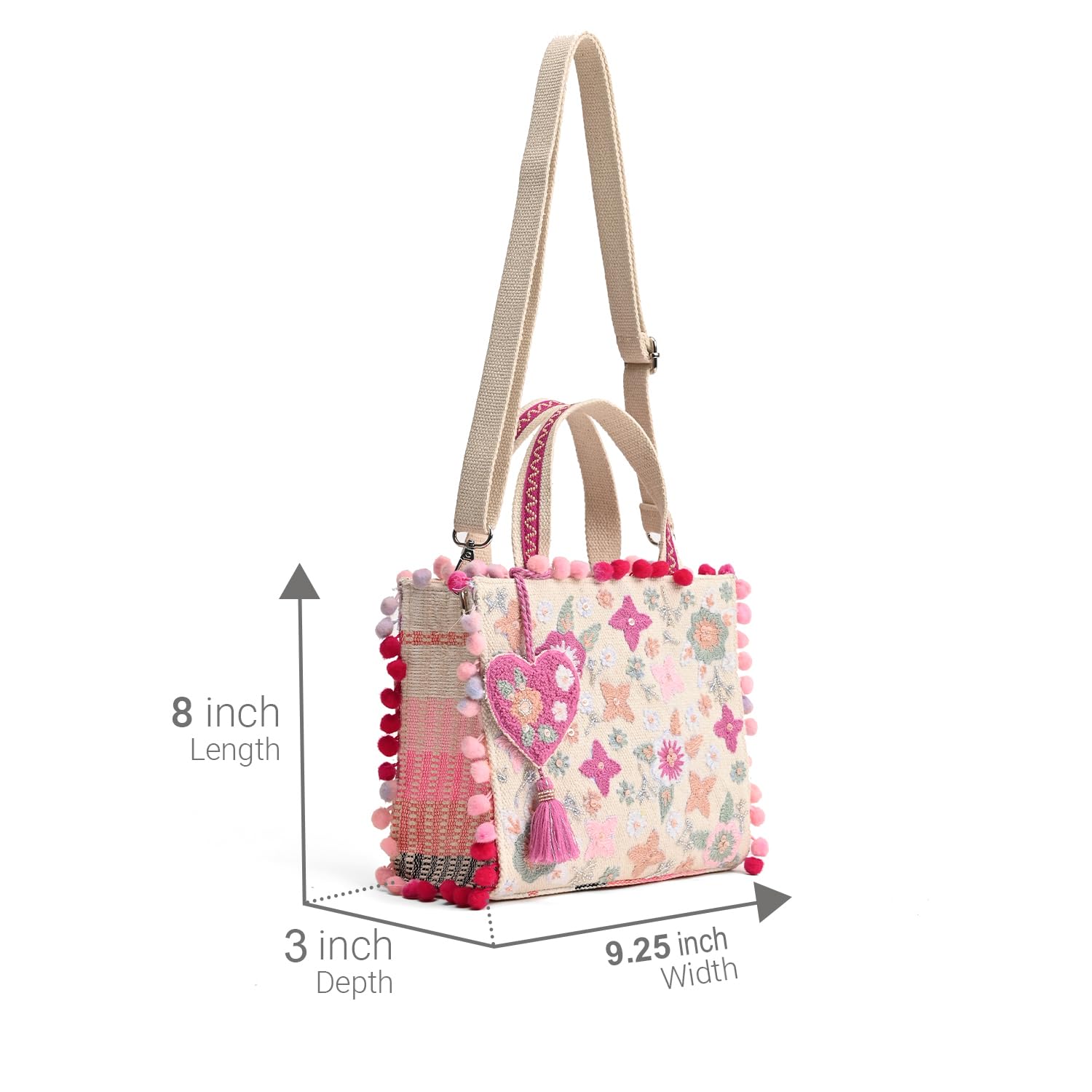 Details: The Whimsical Mini Blush Tote is sure to turn heads. Perfectly sized and chicly detailed, this stylish tote is perfect for day-to-day use or special occasions. With an adjustable and removable crossbody strap, an open back pocket, and a fully lined interior, this tote is both functional and fashionable. The floral embroidery and beadwork at the front add a touch of whimsy and the hand-tufted floral embellished heart tassel hanging adds a unique charm. Make a statement with this gorgeous and versatile bag. Perfect for date nights or a girl's day out, it's spacious enough to store all your essentials while still keeping you looking chic. Carry this with a bright lip, hand-beaded jewels, and a romantic dress for extra charm. Handmade by skilled artisans in India.