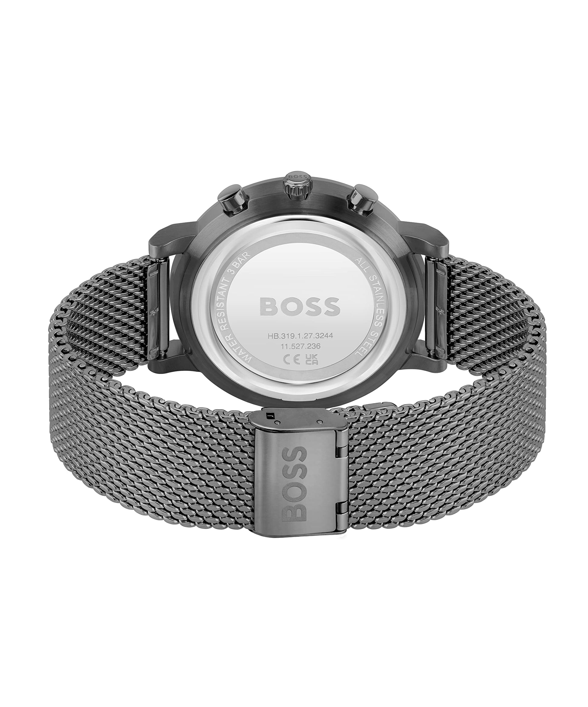 - This men's analog watch from the integrity collection by BOSS merges performance with modern day styling and will surely boost up your style quotient. Nestled in a 43 mm case, the round dial is protected by a mineral glass. The strap is crafted with care using stainless steel that gives a good finish.