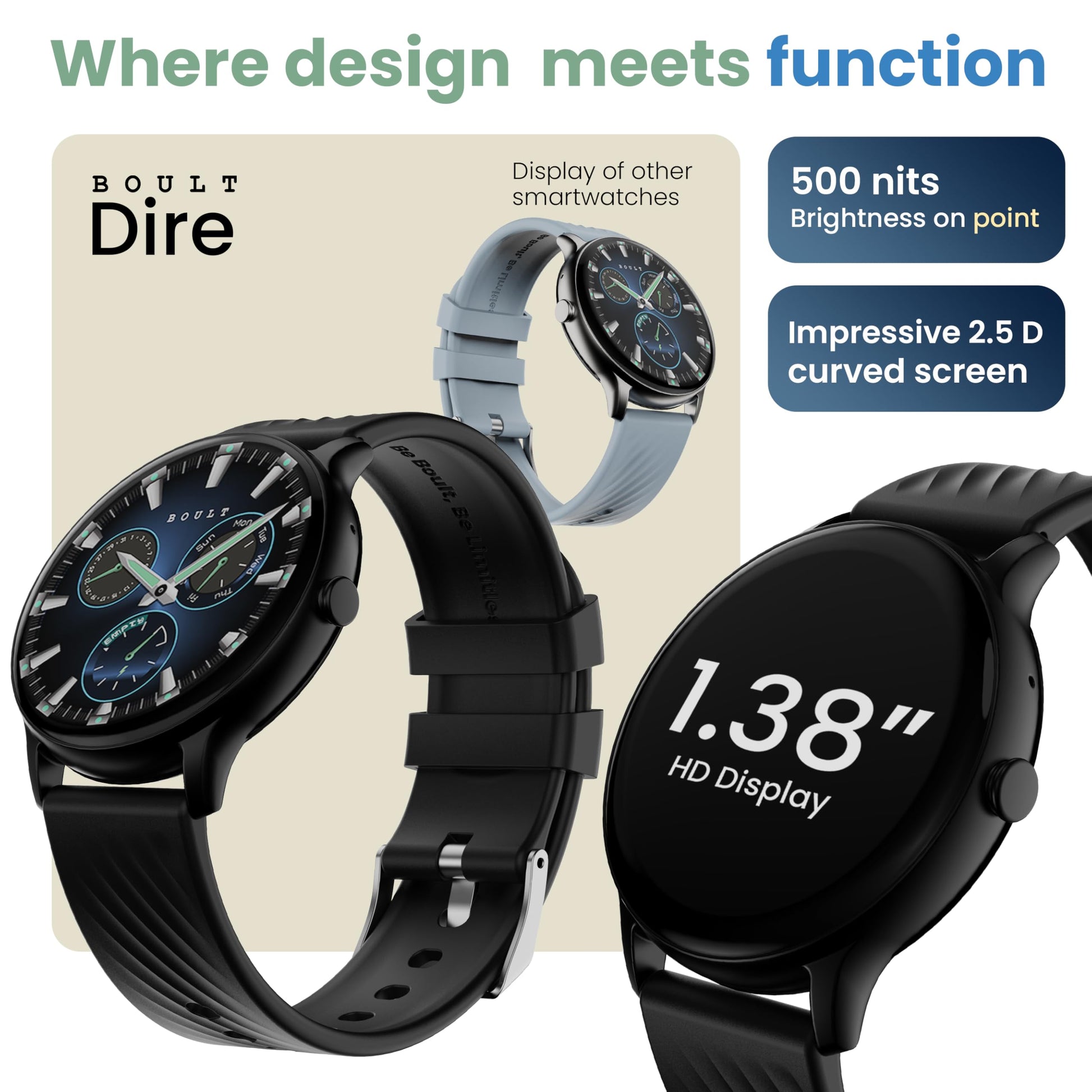 Boult Newly Launched Dire Smartwatch 1.38'' 2.5D Curved HD Display, BT Calling, 500 Nits Brightness, IP67, 250+ Watchfaces, 120+ Sports Modes, AI Voice Assistant, SpO2 Monitoring (Pure Black)