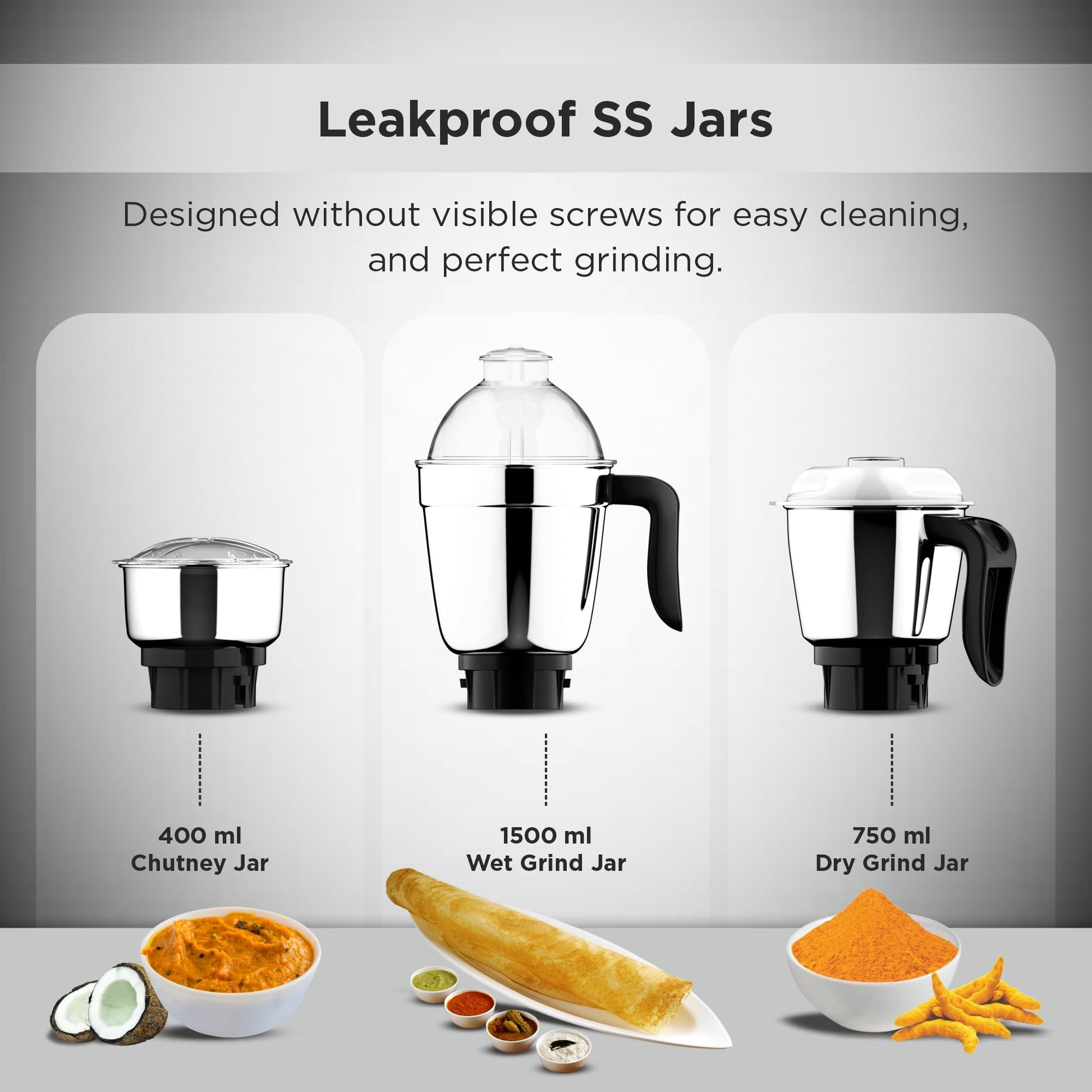 - No of Jars: 4; Jar Size: 0.4,0.75,1 in Ltr; Jar Material: Stainless Steel jars and PC Juicer Jar; Body Material: ABS body; Cord Material: 180 CM; Blade Material: Stainless Steel; Speed Control: 3 Speed motor for faster and efficient grinding.Body: Body made of ABS which is shock free