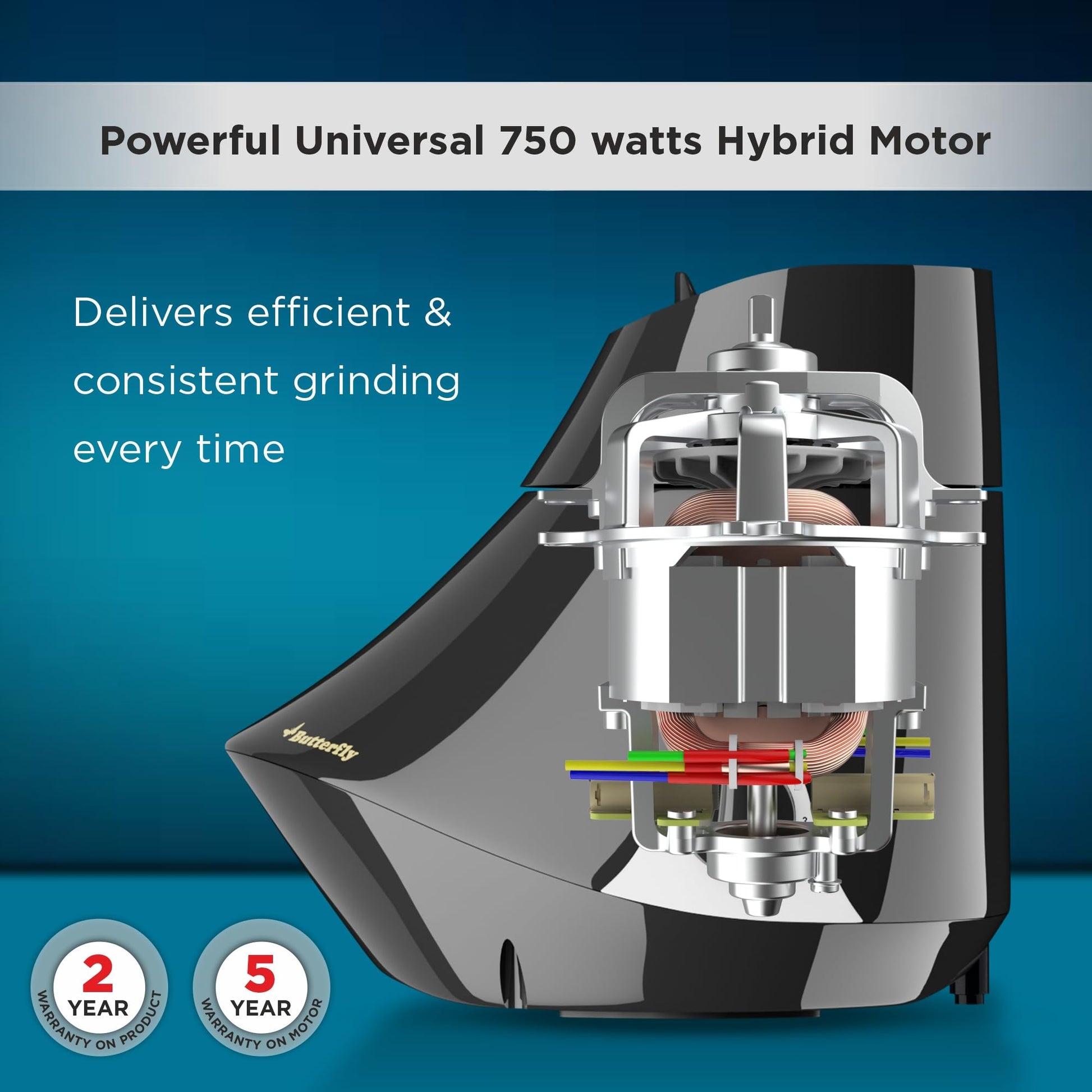 Butterfly Smart 750 Watts Mixer Grinder with 4 Jars | 3 Stainless Steel Jars & 1 Juicer | ABS Body | Heavy Duty Motor | 2 Years Manufacturer's Warranty | Grey